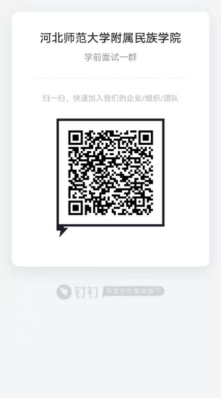 2021年学前教育五年一贯制公费师范生招生面试,参与考生分为两组:石家庄、承德、唐山、廊坊、秦皇岛、衡水考生为一组。保定、沧州、邢台、邯郸、定州、张家口、辛集考生为二组。请各位考生依据分组情况,选择扫描面二维码进入相应钉钉视频面试平台。认真阅读平台群公告要求,按照工作人员提示做好备考工作。