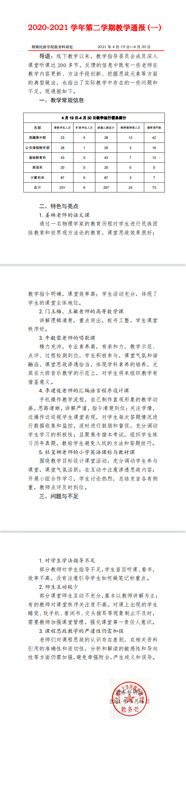 2020-2021 学年第二学期教学通报(一)