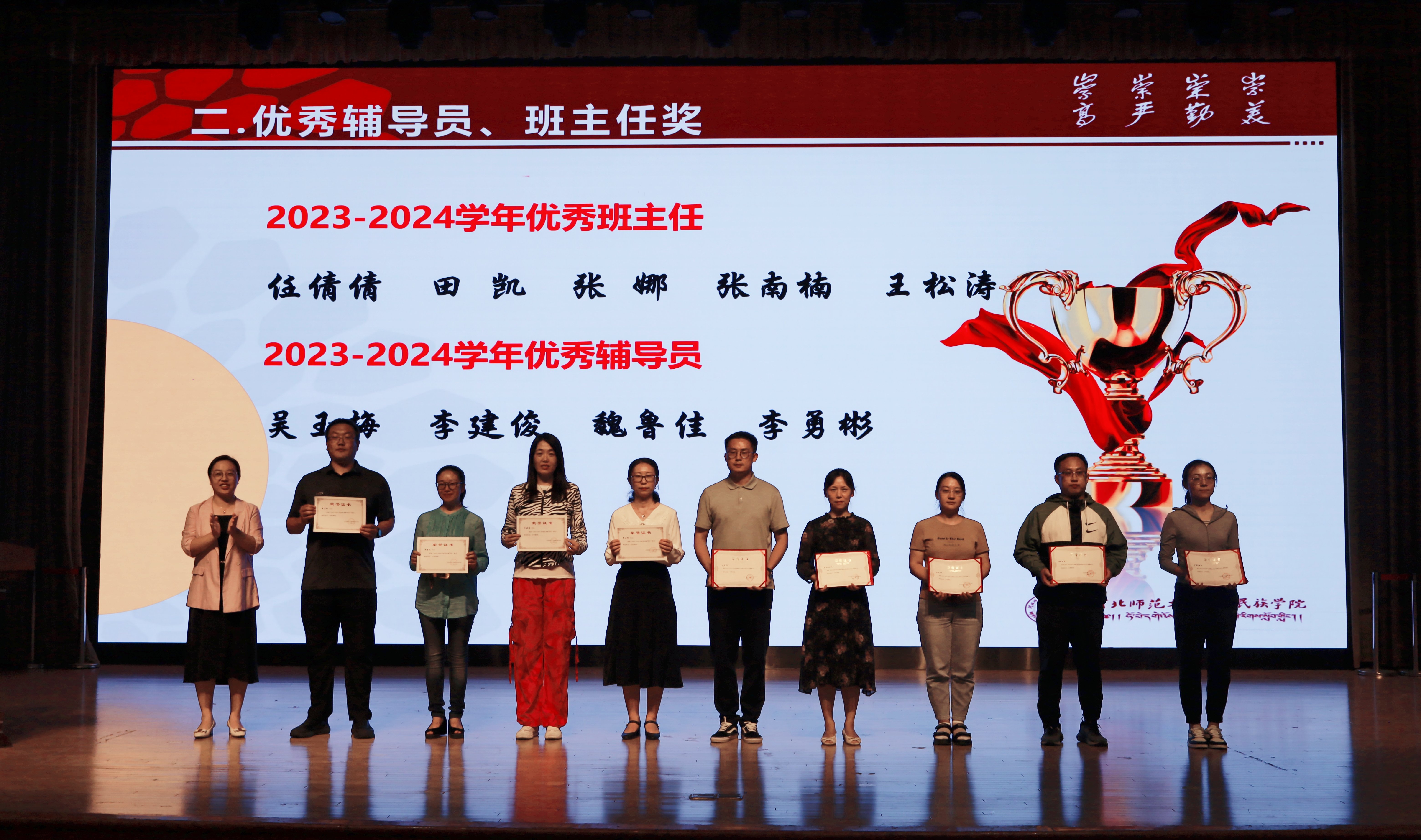 党委书记白少双寄语广大教职工要以受到表彰的教师为榜样,围绕学校的中心工作,从身边事做起,以教育家精神为引领,践行教师群体共同价值追求,时刻牢记立德树人、教书育人初心,切实担当起为党育人、为国育才的光荣使命,努力培养德智体美劳全面发展的社会主义建设者和接班人,为民族学院更加美好的明天努力奋斗!学院将进一步深化教师发展年的主题,加强师德师风建设,加大力度关心教师身心健康,关注教师专业发展,维护教师权益,增进教师福祉。