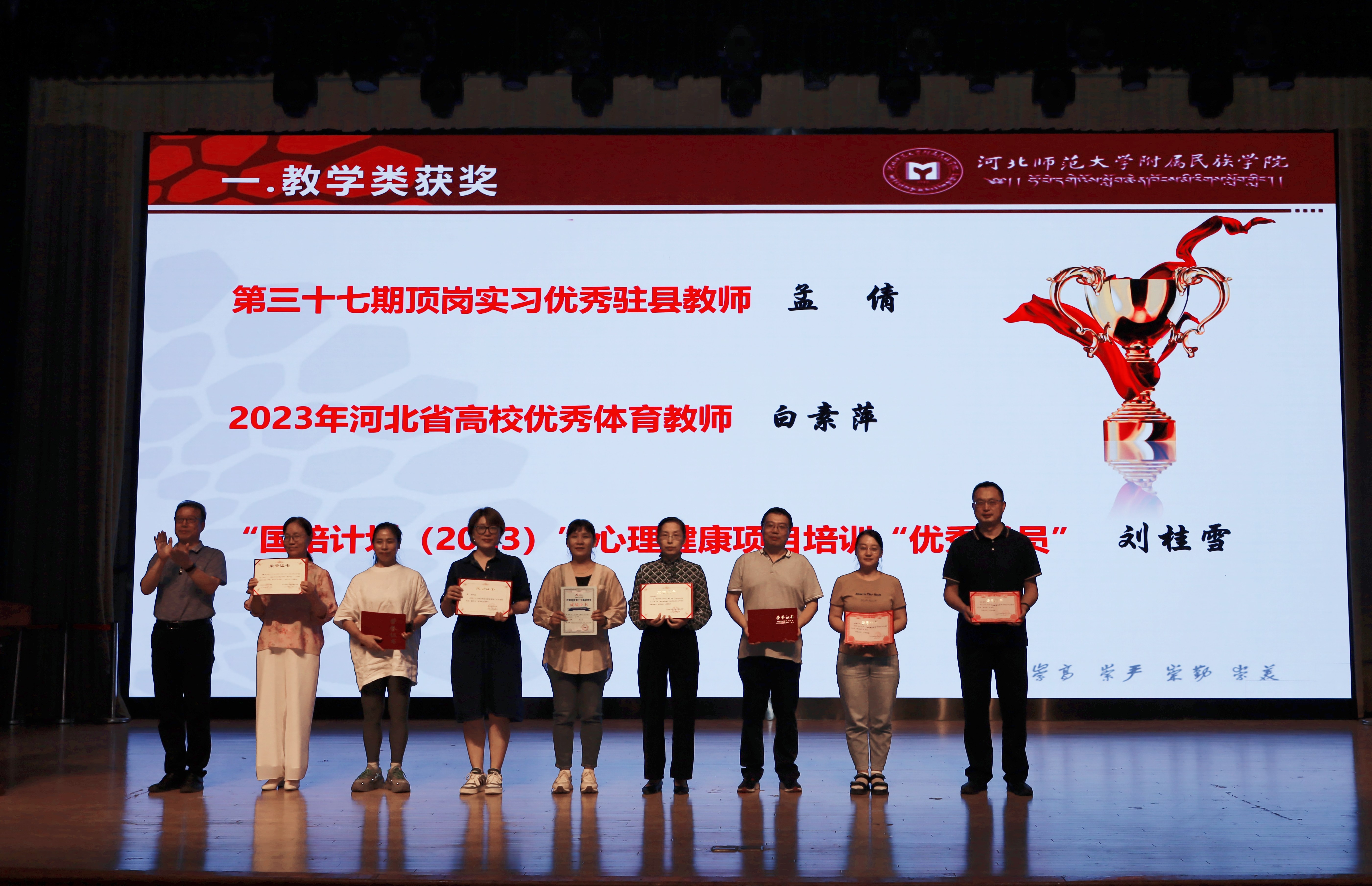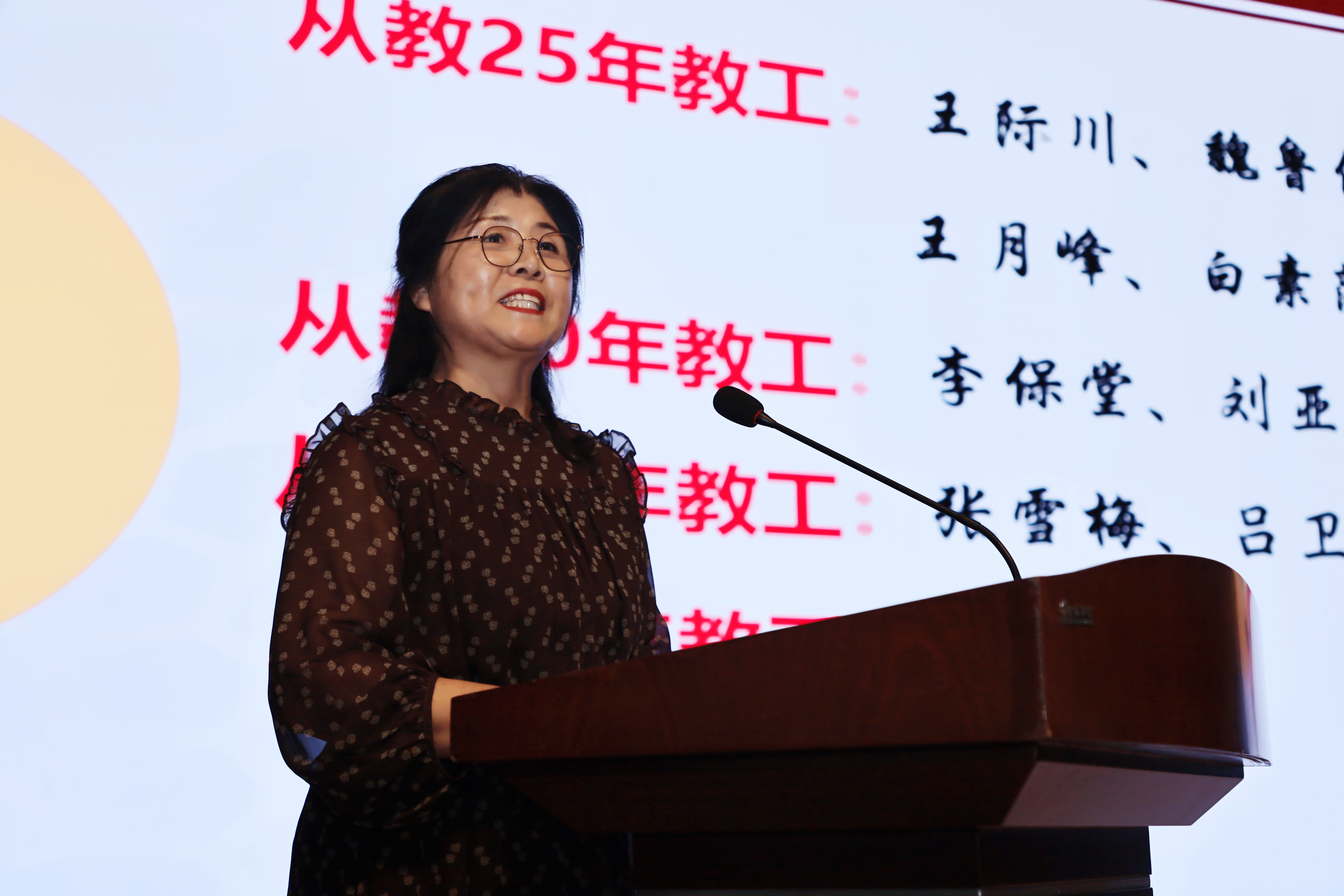 大会向一年来在各个方面取得优秀成绩的教师进行表彰,包括省级师德标兵,从教25年以上教职工,年度先进工作者、优秀共产党员、教学质量优秀奖、突出科研奖励、优秀辅导员、班主任等一大批院级以上荣誉获得者187人次。老教师代表王滨老师、教学类获奖代表苏为民老师、科研奖励代表王勇兵老师、辅导员代表吴玉梅老师分别发言。获奖教师们坚守初心、践行使命的党性修养,爱校如家、崇德向善的敬业精神,勤勉付出、不计得失的高尚情怀,主动担当、自我提高的创新意识,赢得广大师生的赞誉。