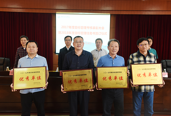 党委副书记唐艳明宣读了《关于表彰2017年度目标管理考核优秀单位的决定》。外国语学院、人文与社会科学学院、化学与生物工程学院、 电子与信息工程学院等4个教学单位,党政办公室、党委宣传部(党委统战部)、保卫处、学生工作部、纪委监察部、人事处、团委、党委组织部、科技处等9个非教学单位受表彰。
