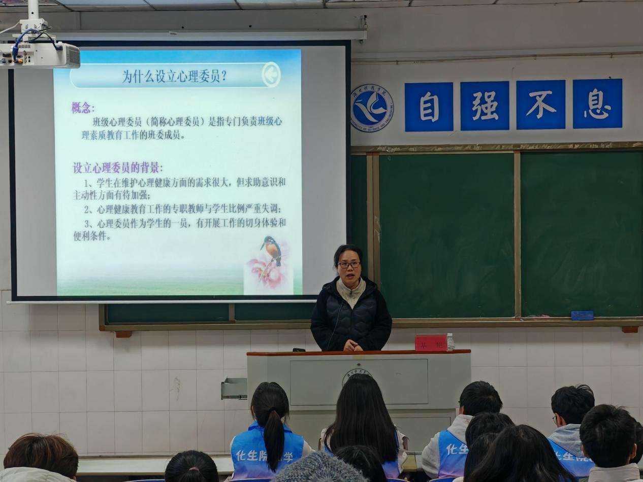(本网讯 陈宇豪)为进一步提升心理信息员在心理健康领域的专业素养与实践能力,切实推动我院学生心理健康工作的高效开展,化学与生物工程学院于2024年11月28日在逸夫楼424教室召开了心理信息员培训会议。本次会议由我院党总支副书记基艳副教授主讲。