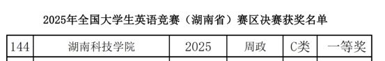 (本网讯 张自强)5月11日,2025年全国大学生英语竞赛(NECCS)湖南省决赛在湖南工商大学举行,我院生物工程2402班周政凭借扎实的语言功底和出色临场发挥,在C类竞赛中脱颖而出,斩获一等奖,为学院争光添彩。