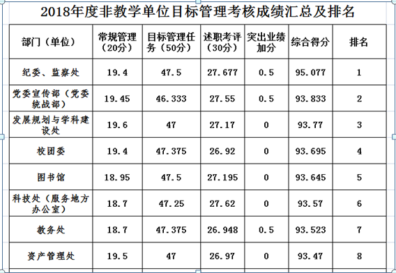 二、非教学系列获评“优秀”等次的单位8个,分别为:1.纪委、监察处;2.党委宣传部(党委统战部);3.发展规划与学科建设处;4.校团委;5.图书馆;6.科技处(服务地方办公室);7.教务处;8.资产管理处。