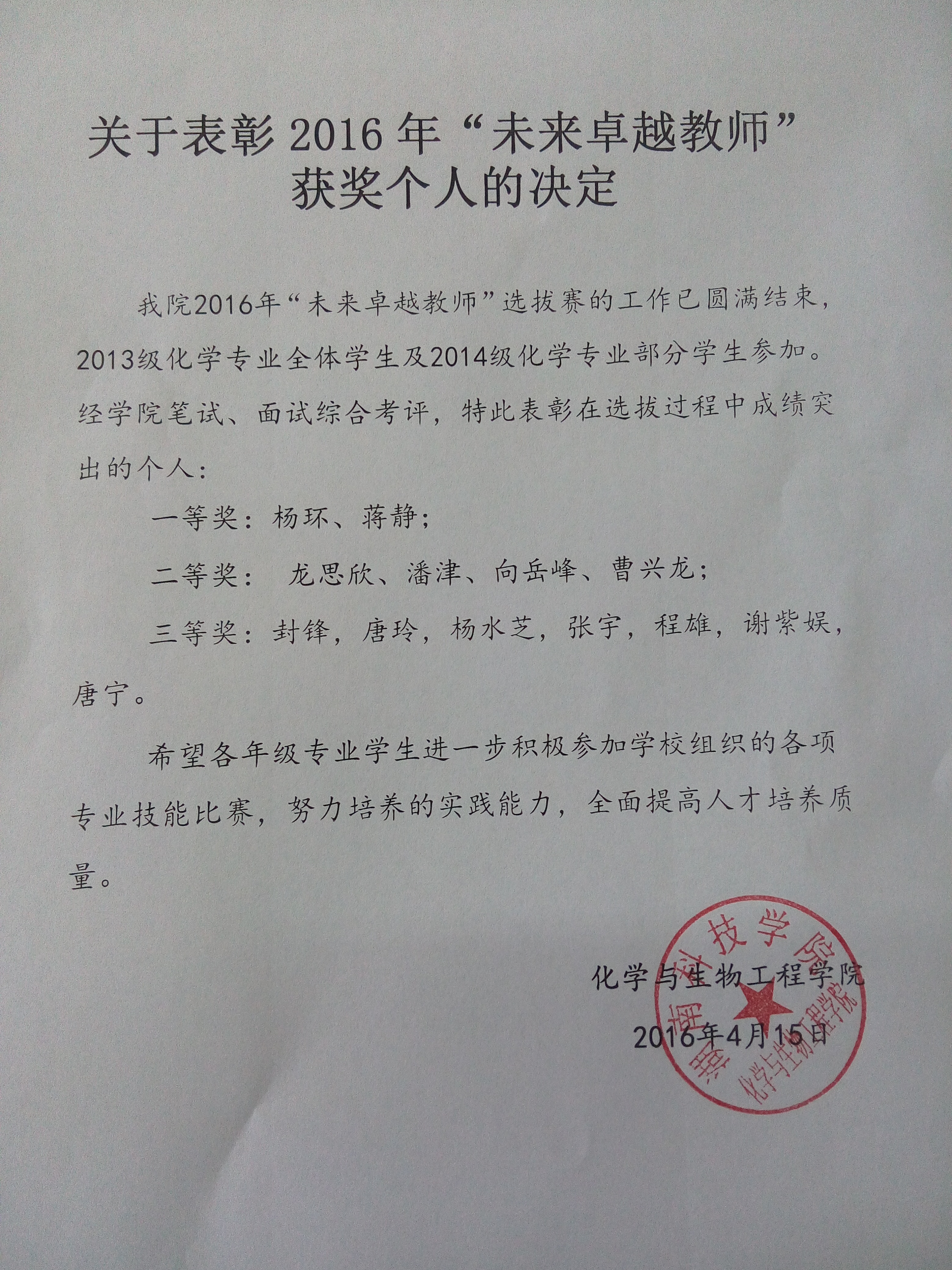 关于表彰2016年“未来卓越教师”获奖个人的决定