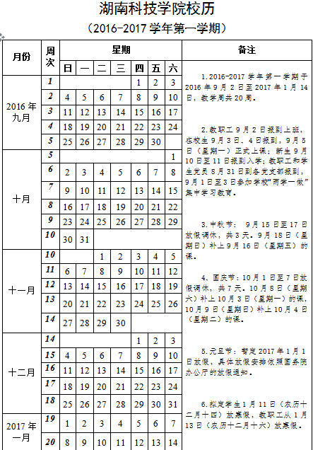 bat365中文官方网站校历 (2016-2017学年第一学期)