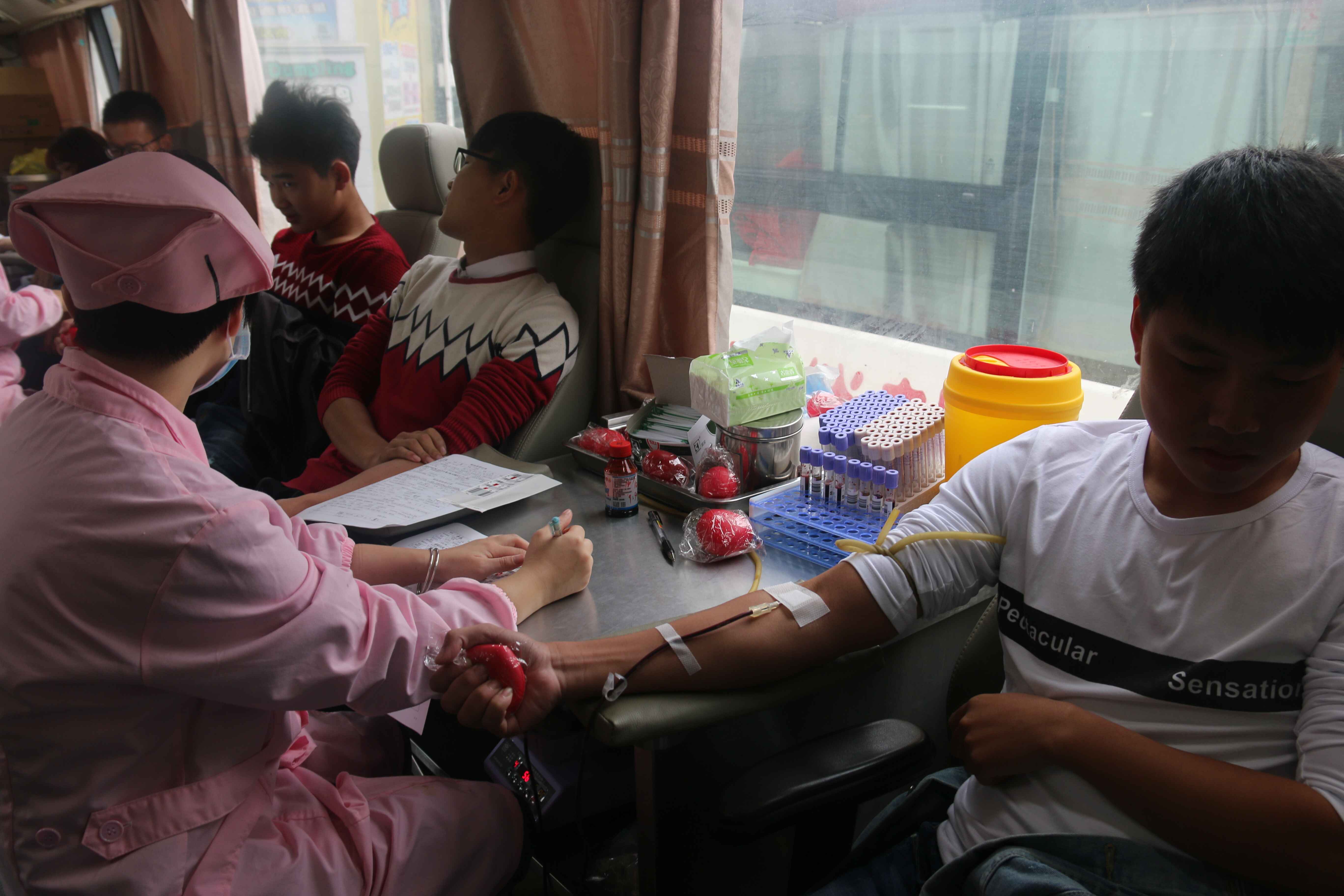 寒风烈烈,挡不住志愿者的热情;秋雨飘飘,沾不湿献血者的期盼。在志愿者的组织下,献血者按顺序进行填表登记、血型检测和抽血。已入深秋,飒飒的寒风拍打在帐篷上,但却没能阻挡献血者们的热情,这无疑是“人人为我、我为人人”的最好体现。在工作人员的讲解与鼓励下,每一位奉献爱心的同学纷纷献出了300cc或400cc的血。