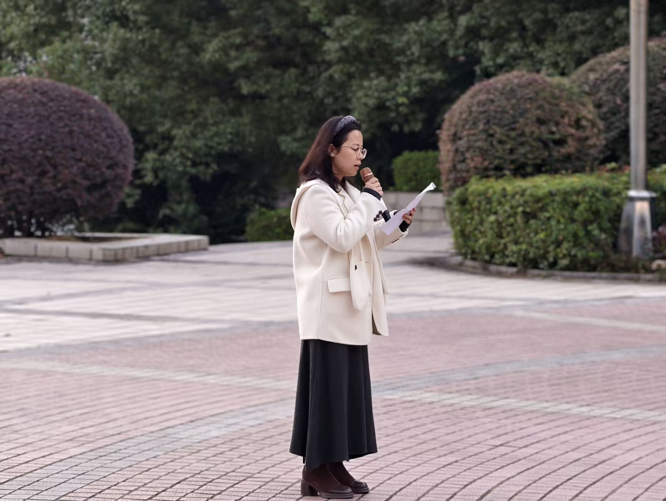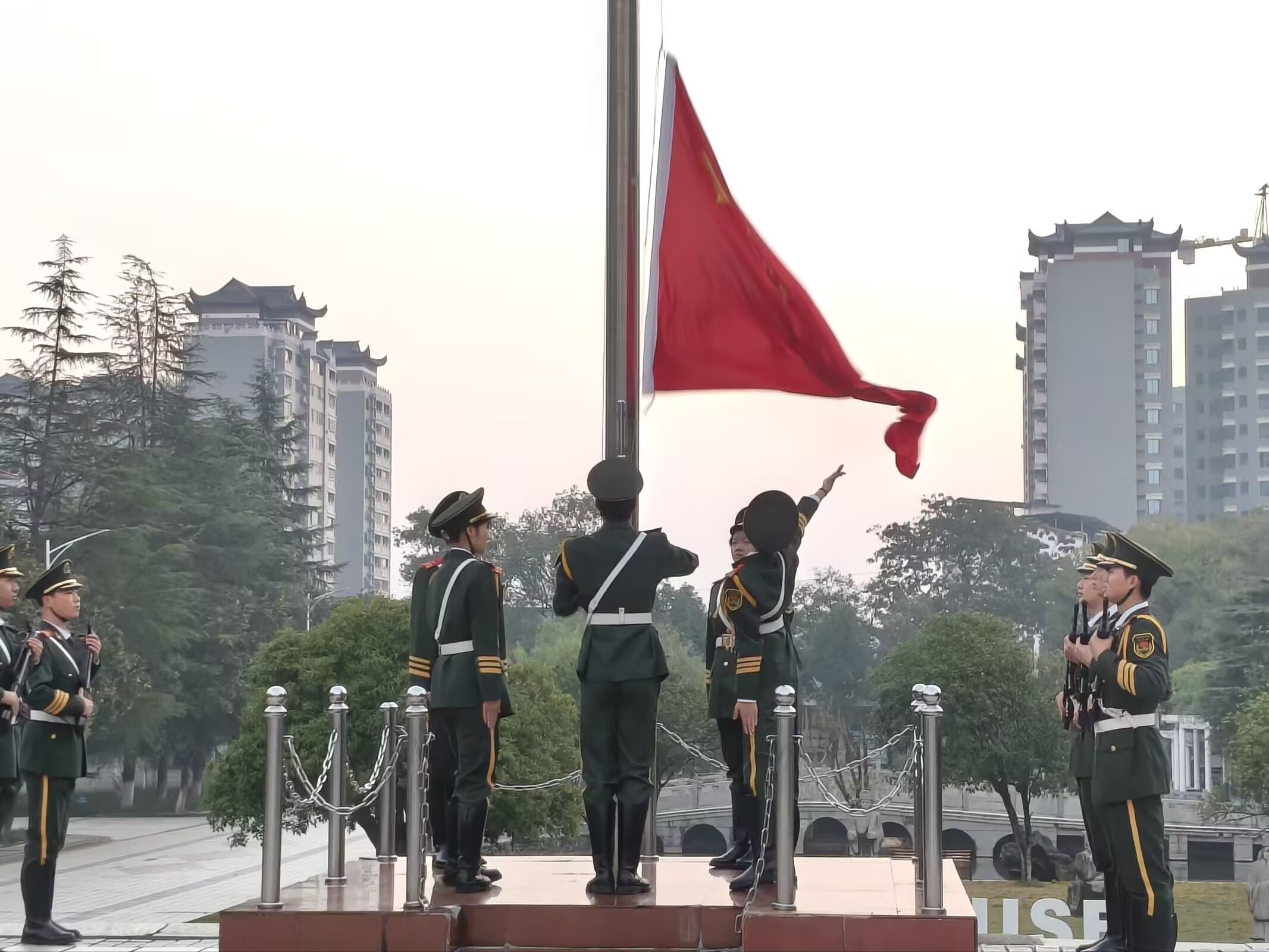 早晨七时,升旗仪式正式开始。国旗班的成员们迈着整齐划一、铿锵有力的步伐,护卫着五星红旗走向升旗台。随着雄壮的《义勇军进行曲》奏响,全体师生面向国旗肃立,行注目礼。