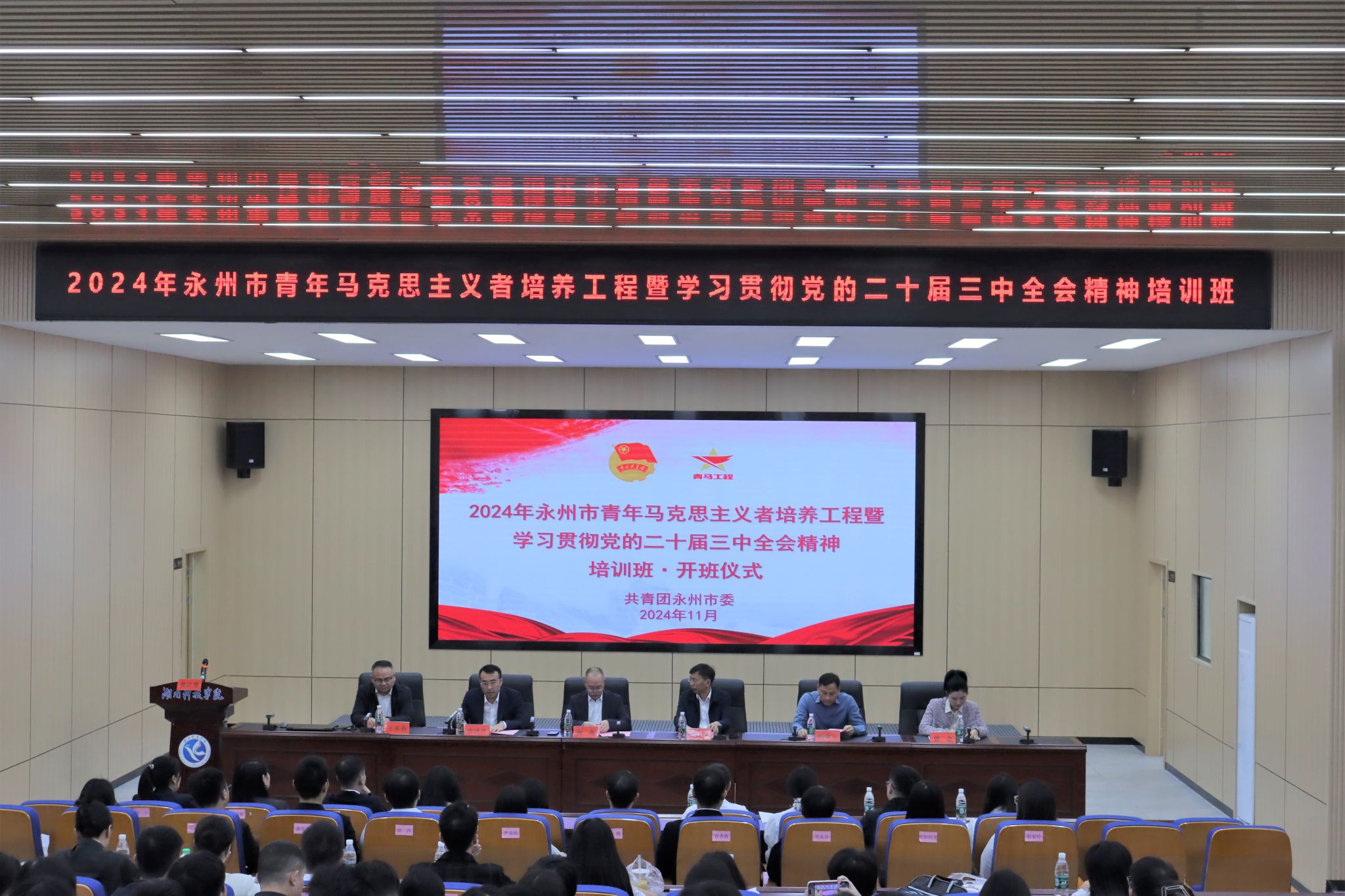 本网讯(通讯员 曹湖云 李师)11月5日,2024年永州市青年马克思主义者培养工程暨学习贯彻党的二十届三中全会精神培训班在bat365官网开班。校党委委员、副校长何海,永州市委组织部副部长何红喜,团市委副书记唐泽彦,团市委组宣部部长曾念出席开班典礼,来自永州市各乡镇街道和学校战线的基层优秀团干部以及bat365官网优秀团员、团干部代表共60余人参加活动,开班典礼由唐泽彦主持。