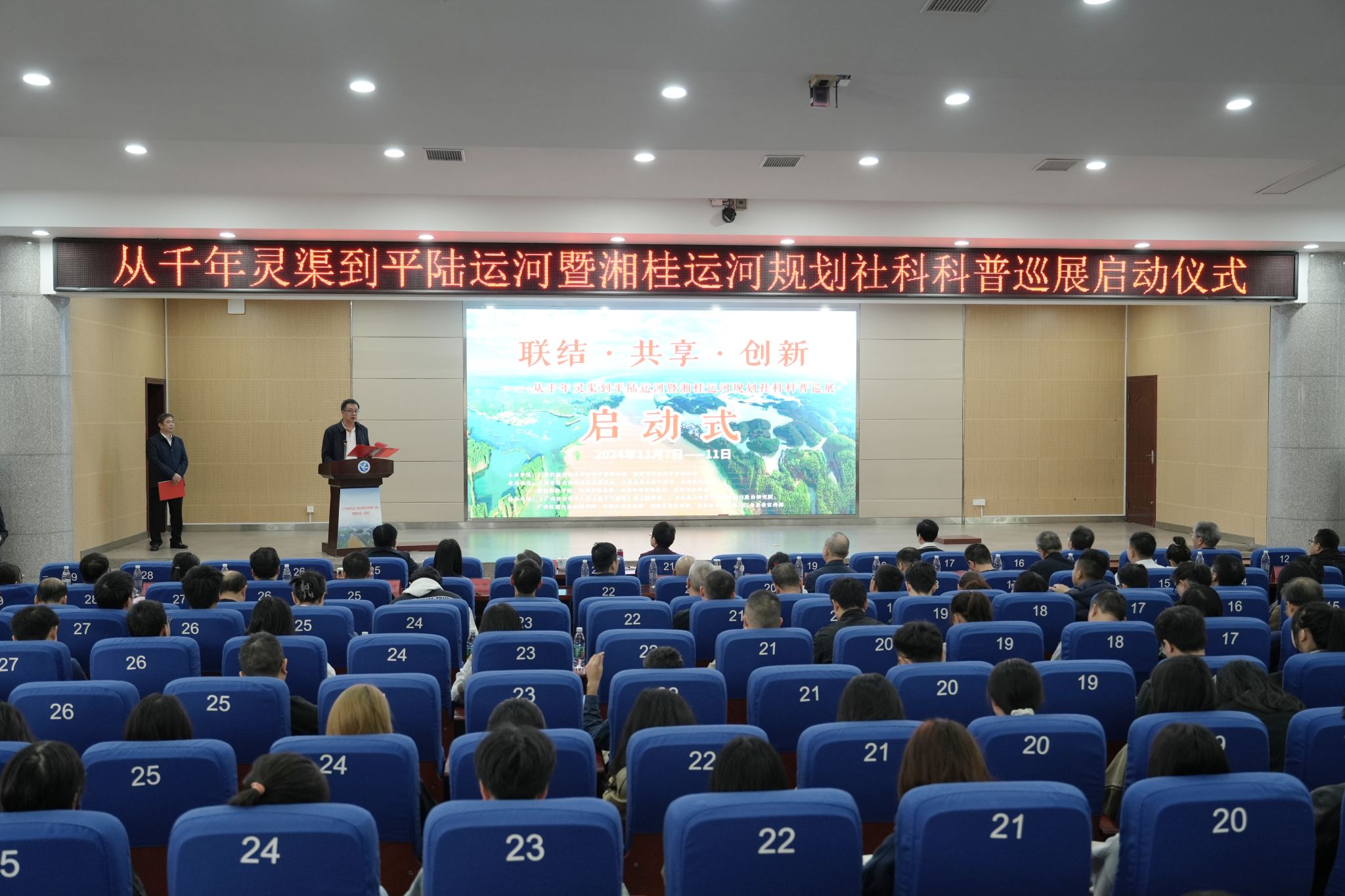 本网讯(记者 向薛峰 摄影 温百石)11月7日,联结·共享·创新——从千年灵渠到平陆运河·湘桂运河规划社科科普巡展(第七站)启动仪式在bat365官网举行。广西社科联副主席刘俊,湖南省社科联党组成员、副主席、秘书长(兼)贺建湘,永州市副市长周云玲,永州市人大常委会党组成员、副主任提名人选、市总工会主席(兼)李天明,广西社科联兼职副主席、广西财经学院校长夏飞,校党委书记李钢,校党委副书记、社科联主席宋宏福出席活动,活动由李天明主持。