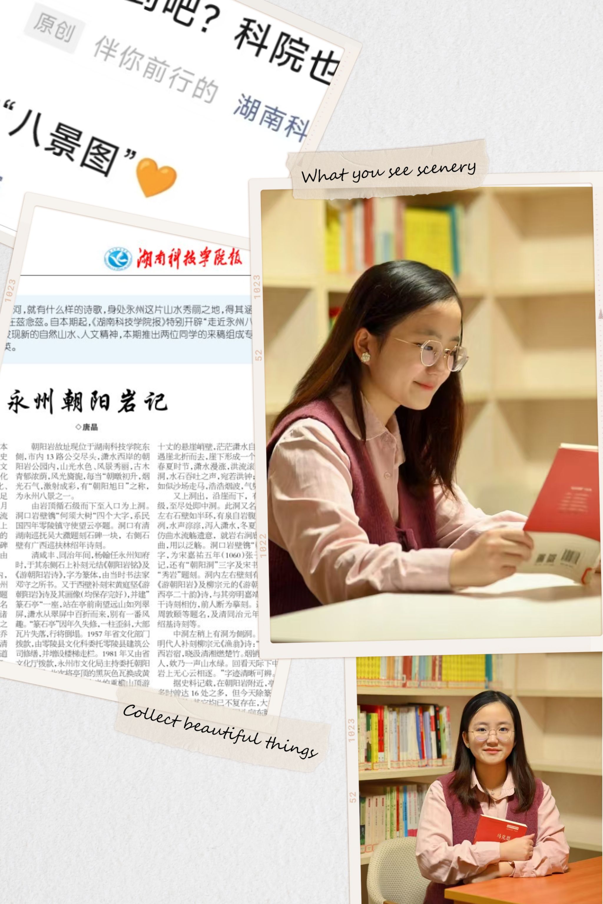 在我印象最深刻的一次创作经历中,我和十几位志同道合的伙伴共同推进并策划了一个项目——《bat365中文官方网站报》特设的“走近永州八景”专栏。我们不仅在校内发起了征稿活动,还组织了多场线下活动,旨在鼓励师生们从全新的角度探索永州的自然美景与深厚的人文精神,以此来传递永州八景丰富的文化价值。经过团队与老师们的反复讨论和精心准备,这一专栏最终赢得了校内外广泛的好评,成为了传承和推广永州文化的一股重要力量。作为此次项目的参与者之一,我深感自豪,因为这不仅是对永州八景文化的致敬,更是对我们团队努力成果的肯定。“每一份努力都藏着未来的光芒”,这句话成为了我继续前行的动力源泉。