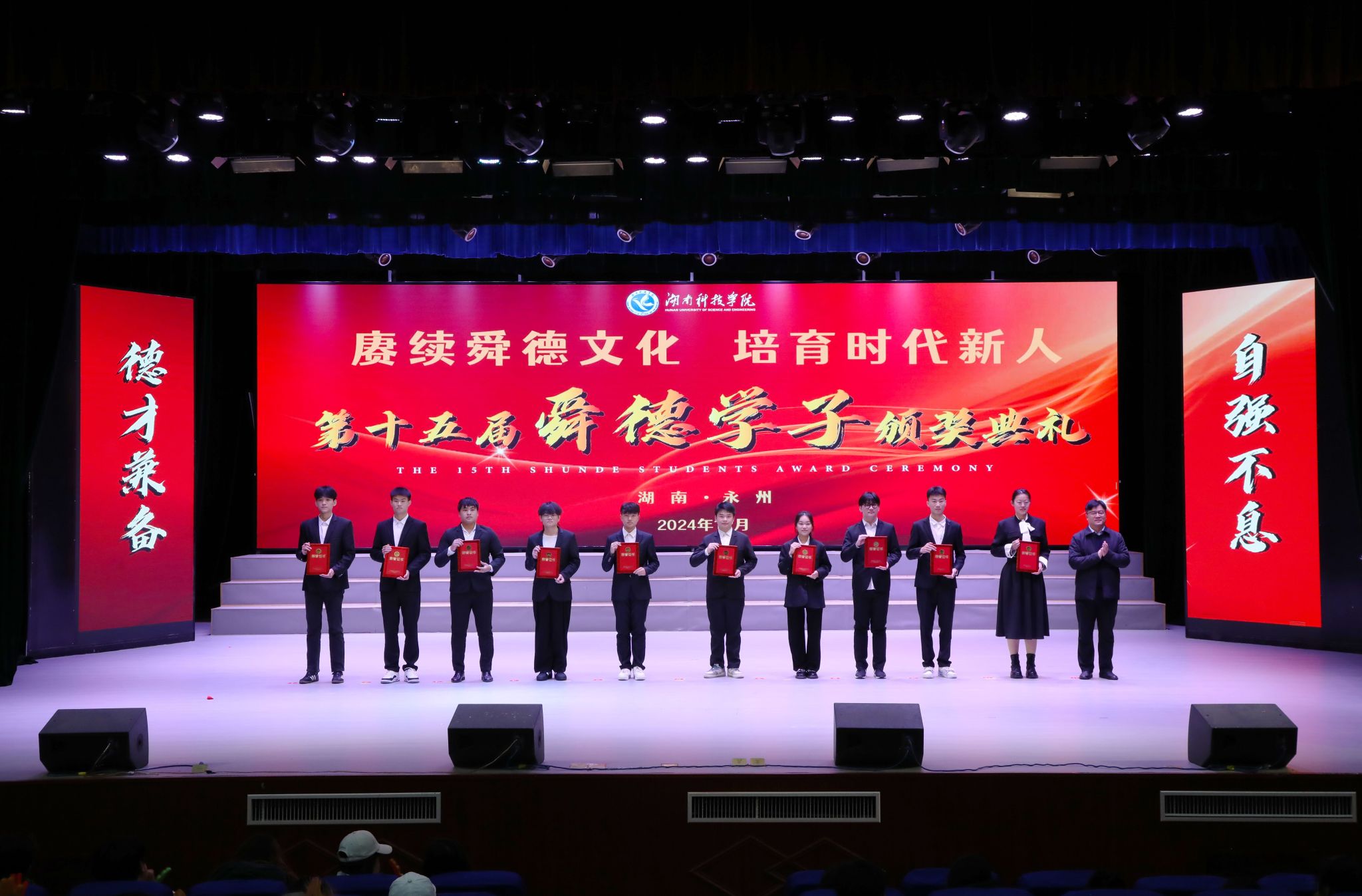 本网讯(记者 唐晶 刘斌 彭尧煜 摄影 谢志豪)赓续舜德文化,培育时代新人。12月10日,学校举行第十五届“舜德学子”颁奖典礼,104名优秀学子获表彰。校党委书记李钢,党委副书记、校长黄创霞,校领导宋宏福、李常健、吴小林、陈灿军,党委委员、组织部部长杨涛,校友企业代表、安骏物流公益基金会管理部经理陈泽出席典礼。