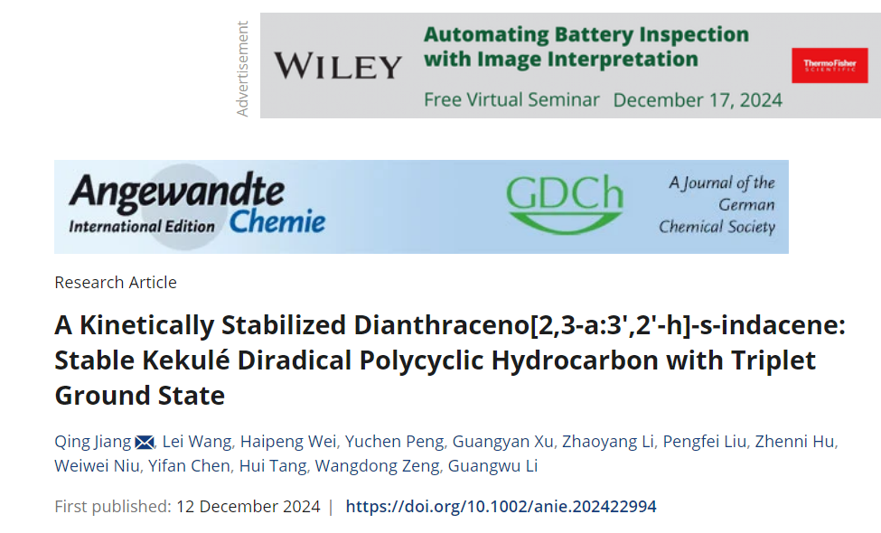 本网讯(通讯员 袁志辉)近日,化学顶级权威期刊《Angewandte Chemie International Edition 》在线刊登了bat365官网化学与生物工程学院蒋清课题组的研究论文“A Kinetically Stabilized Dianthraceno[2,3-a:3',2'-h]-s-indacene: Stable Kekulé Diradical Polycyclic Hydrocarbon with Triplet Ground State”(稳定的三线态基态dianthraceno[2,3-a:3',2'-h]-s-indacene双自由基分子),文章的第一和通讯作者为蒋清博士,bat365官网为第一和唯一通讯单位。实现了bat365官网在该研究领域的新突破。