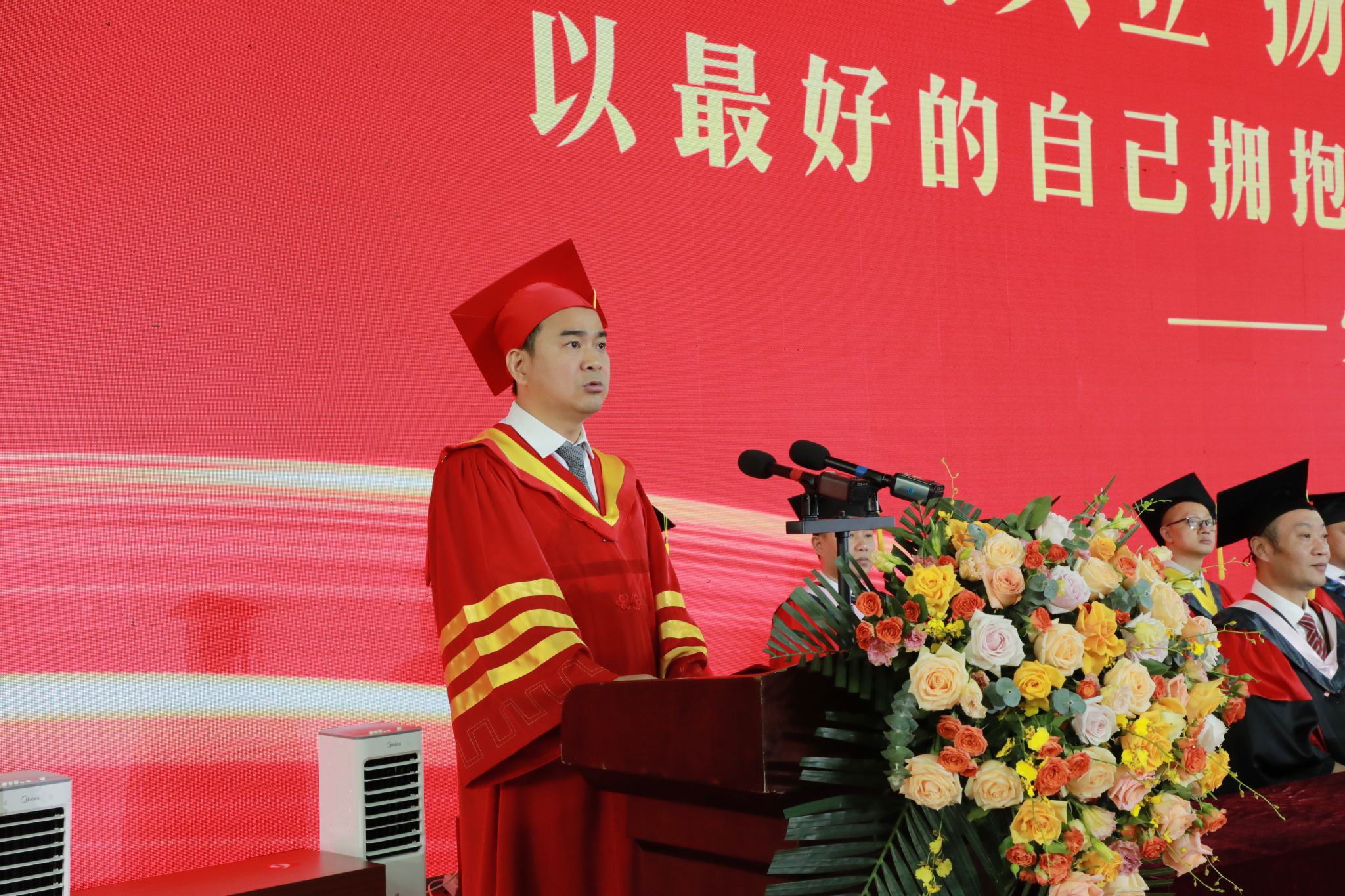 黄创霞代表学校为全体毕业生送上最真诚的祝福,并以《乘风破浪潮头立 扬帆远航正当时 以最好的自己拥抱更好的未来》为题,对即将开启人生新征程的毕业生们提出了三点希望:一是追寻人生意义,遇见最好的自己。在人生的旅途上全力以赴、追光而行。二是胸怀国之大者,成就最好的自己。以青春之我建功新时代,以奋斗之我逐梦新征程。三是笑对人生百态,拥抱最好的自己。在奔赴山海、追逐星辰的过程中,温暖自己,汲取力量。