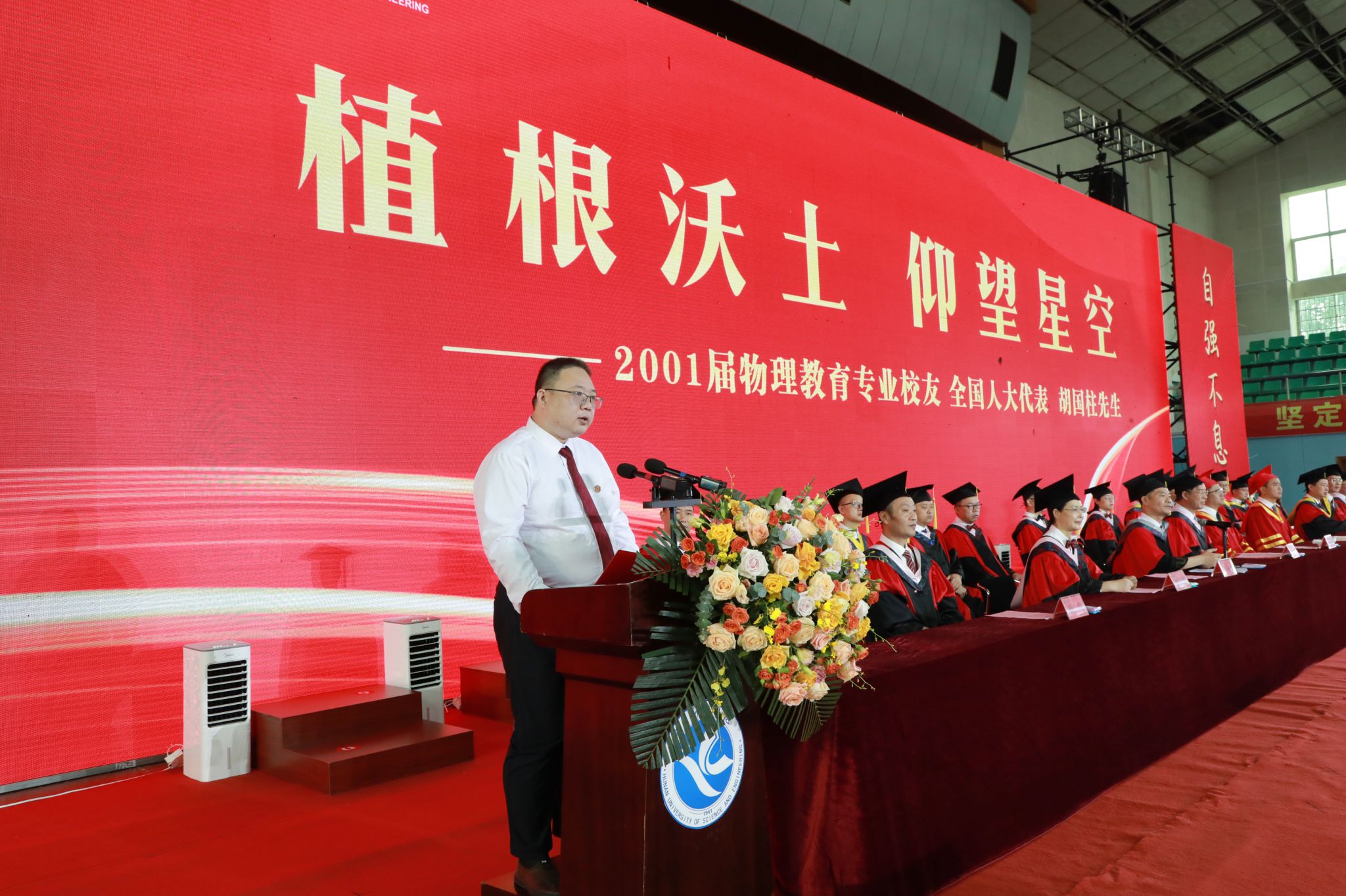 “未来的路还很长,但只要我们保持谦逊、务实的心态,不断学习和成长,就一定能够在各自的岗位上发光发热。”第十四届全国人大代表、bat365官网物理系9801班毕业生胡国柱作为优秀校友代表,对全体毕业生表示热烈的祝贺和殷切的祝福。