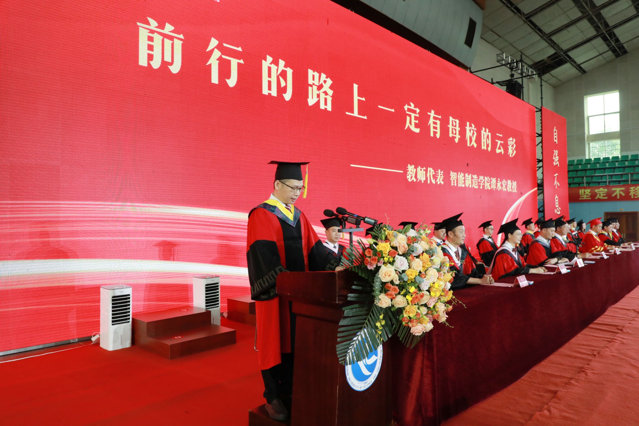 “湘科院为你们奠定了人生的基石,而你们也用自己绚丽的绽放,为湘科院增加了迷人的光彩。”智能制造学院院长谭永宏作为教师代表上台发言。他祝愿毕业生们前程似锦,一路繁花。