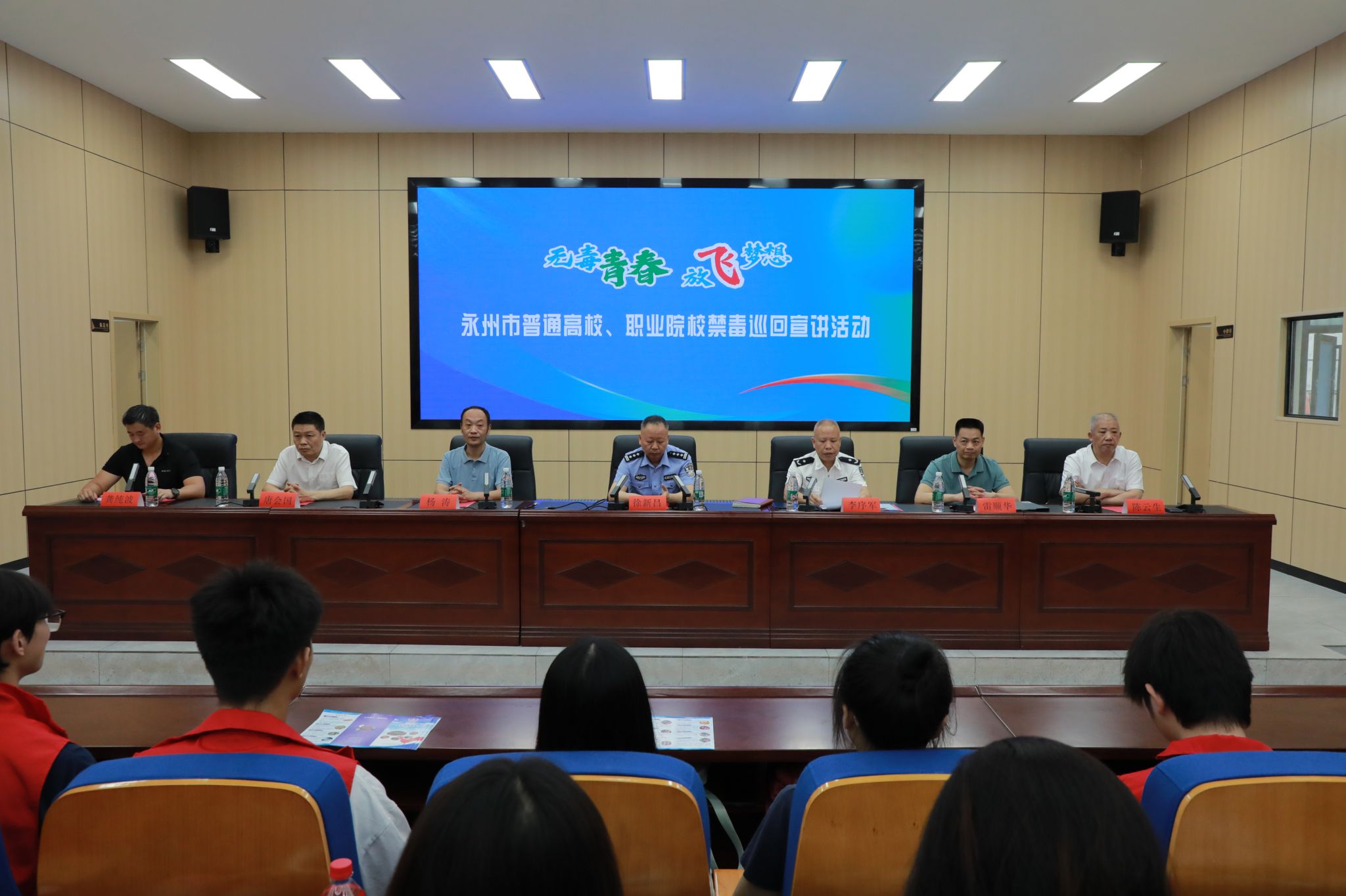 本网讯(记者 赵丹 向薛峰 温百石)6月12日,“无毒青春,放飞梦想”永州市普通高校、职业院校禁毒巡回宣讲活动在bat365官网举行。永州市公安局党委副书记、副局长、市禁毒办第一副主任雷顺华,湖南省戒毒管理局教育矫治处处长徐新昌,永州市强制隔离戒毒所党委书记、所长李序军,永州市强制隔离戒毒所党委副书记、政委唐会国,零陵区副区长、公安局长陈云生,学校党委委员、组织部部长杨涛等出席活动,师生代表共200余人参加活动。