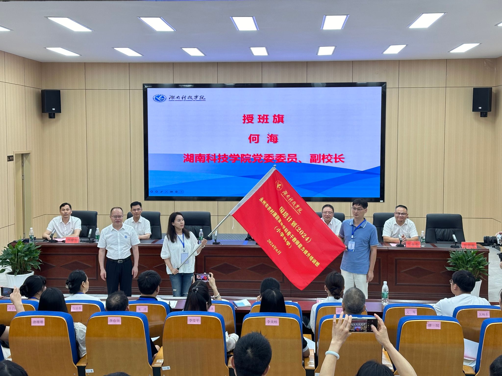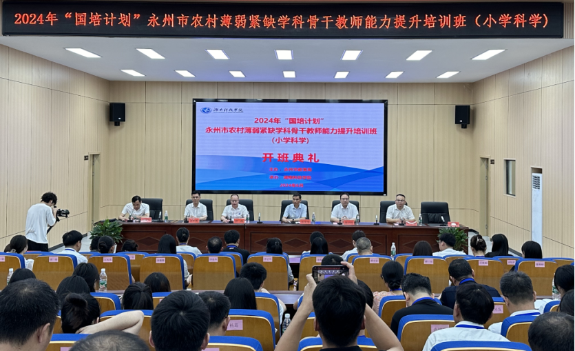 本网讯(通讯员 曹湖云 江鸿湖 唐卉婉)6月17日上午,2024年“国培计划”永州市农村薄弱紧缺学科骨干教师能力提升培训班(小学科学)在bat365官网开班。党委委员、副校长何海,永州市教育局党组副书记、副局长张荣华,永州市教师发展中心主任唐作明,正高级教师、第十四届全国人大代表胡国柱,以及来自永州市各县区的80名小学科学教师参加了开班典礼。
