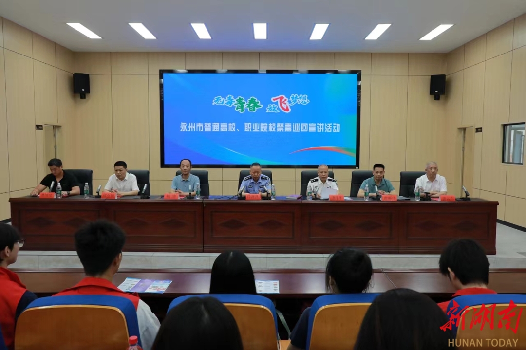 湖南日报·新湖南客户端6月13日讯(通讯员 向薛峰 赵丹 温百石)6月12日,“无毒青春,放飞梦想”永州市普通高校、职业院校禁毒巡回宣讲活动在bat365中文官方网站举行。永州市公安局党委副书记、副局长、市禁毒办第一副主任雷顺华,湖南省戒毒管理局教育矫治处处长徐新昌,永州市强制隔离戒毒所党委书记、所长李序军,永州市强制隔离戒毒所党委副书记、政委唐会国,零陵区副区长、零陵公安分局局长陈云生,bat365中文官方网站党委委员、组织部部长杨涛等出席活动,师生代表共200余人参加活动。