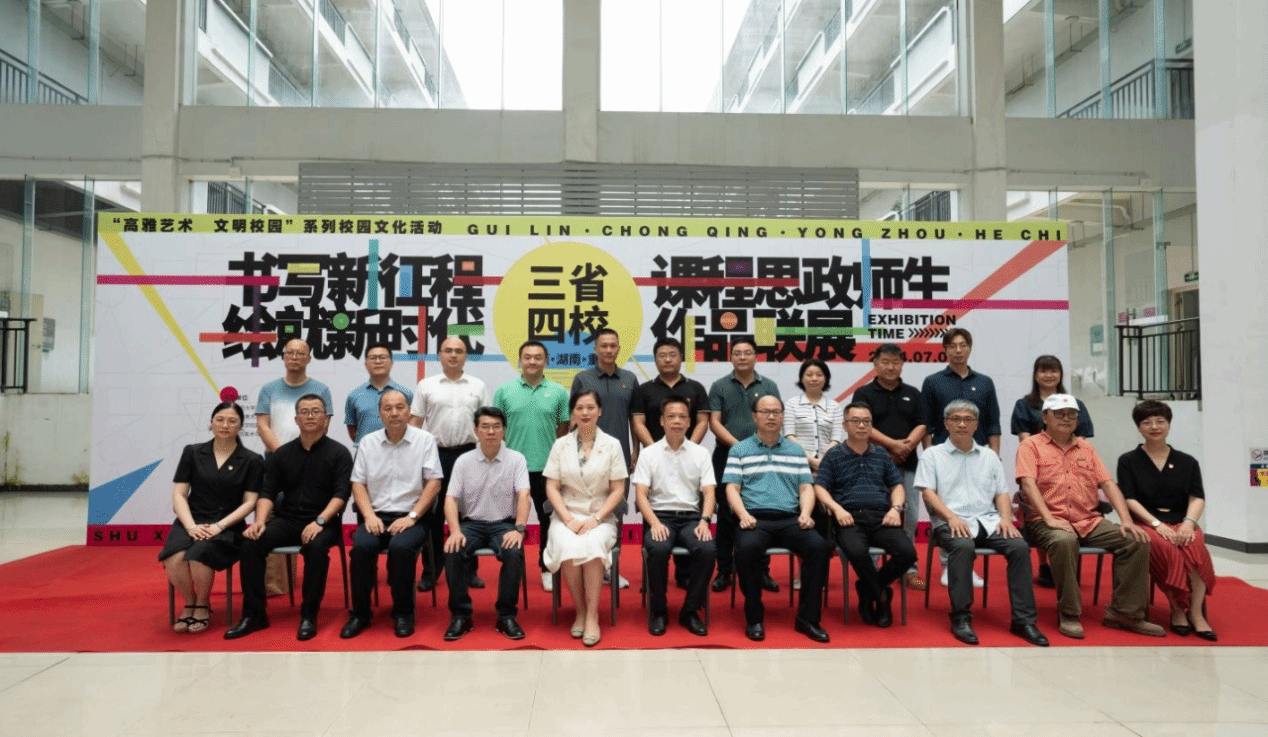 本网讯(通讯员 唐天田)7月1日,由广西师范大学美术学院、西南大学美术学院、bat365中文官方网站美术与艺术设计学院、河池学院美术与设计学院联合主办,广西师范大学校党委宣传部、美术学院联合承办的“书写新征程,绘就新时代”三省四校课程思政美术作品联展在广西师范大学开幕。bat365官网美术与艺术设计学院院长张建利出席开幕式并致辞。