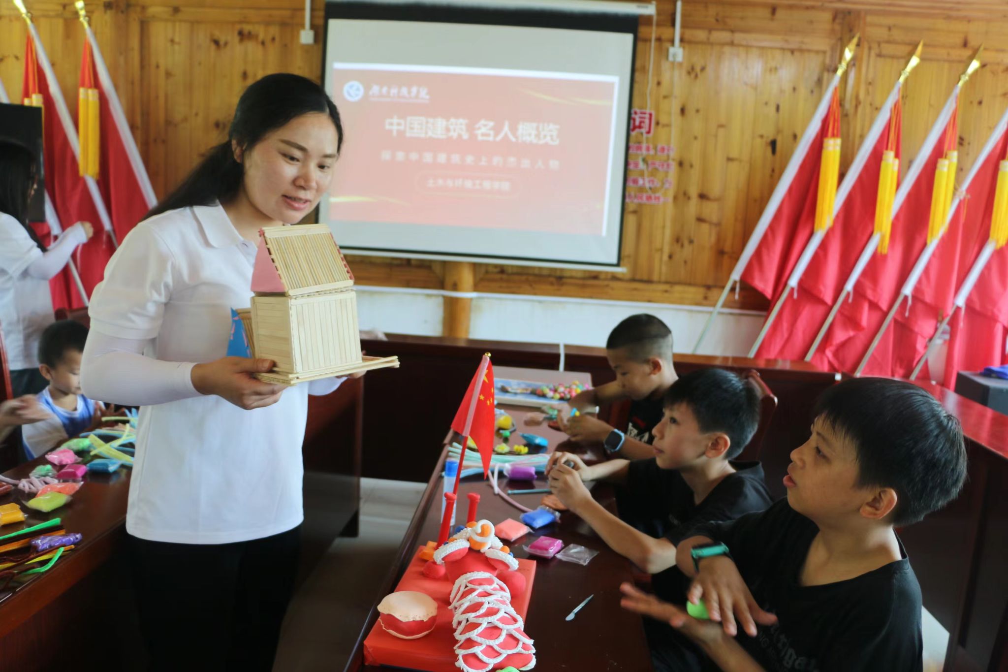 团队成员还前往芋头村为当地孩子们讲述了我国著名工程师的故事和他们建设美好家园的梦想,从鲁班到茅以升,生动介绍了著名建筑物的设计理念,也为孩子们深入浅出地介绍了砖石质文物智慧化保护利用技术湖南省重点实验室的研究项目,引导孩子们遨游知识海洋,心怀科学梦想,坚定强国信念,建设美好家乡。