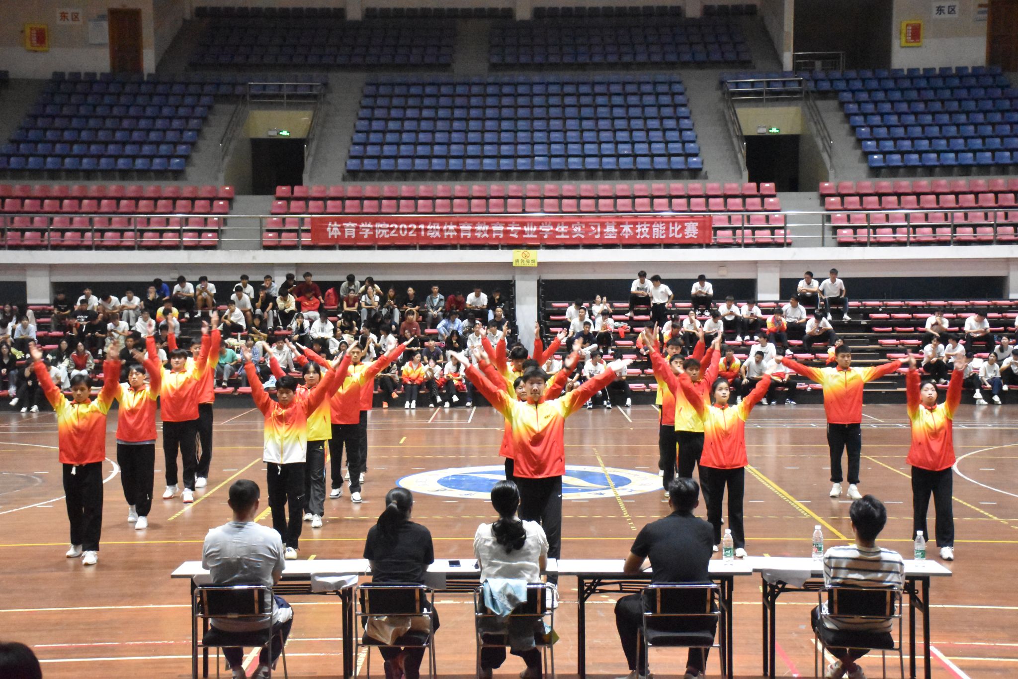 本网讯(通讯员 杨安琪 罗君波 唐立)9月22日,体育学院在体育馆举办2021级体育教育专业教育实习师范技能比赛,21级全体学生参与。本次比赛旨在提升学生的教学技能和实践能力,检验实训教学的学习成果,进一步提高体育教育专业学生的综合能力。