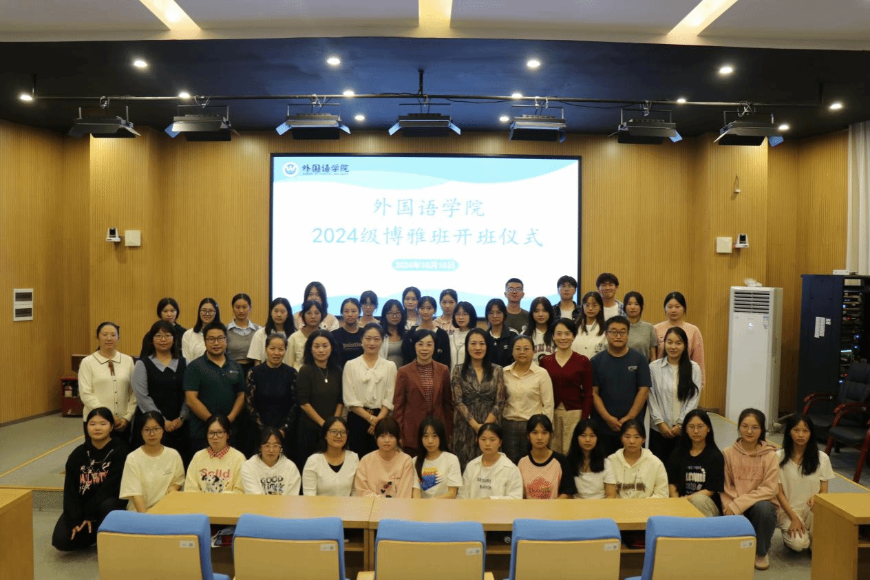 本网讯(通讯员 蒋海霞 郭建伟)为探索数智时代外语课程育人新范式、外语教育数智化转型新路径和卓越英语教师的培养新模式,10月10日晚,外国语学院在博雅楼东三报告厅举行2024级博雅班开班仪式。外国语学院院长何丽萍、党总支副书记罗晶、副院长胡维、英语系系主任郭建伟及博雅班导师共同出席。仪式由副院长黄昊文主持。