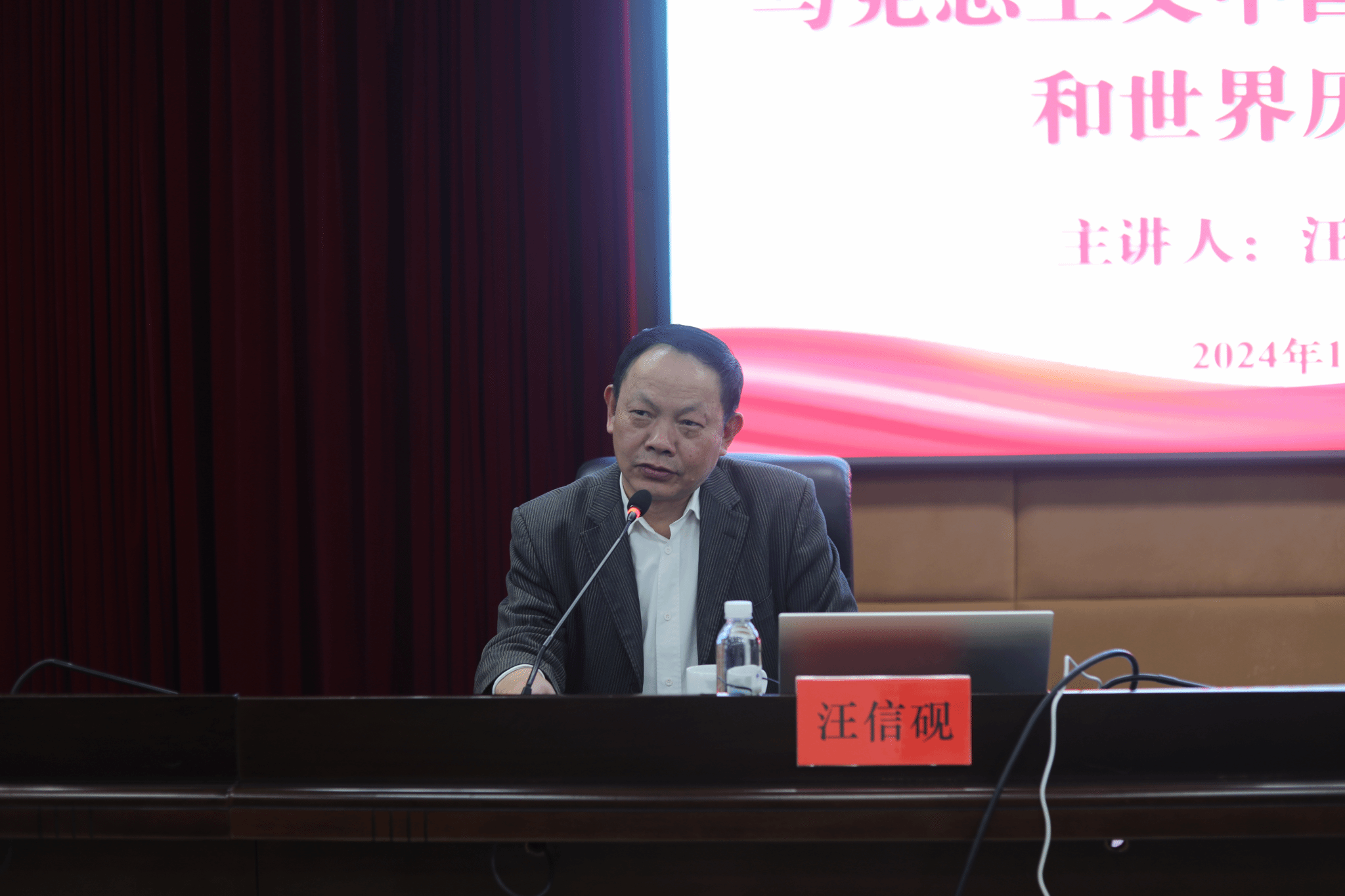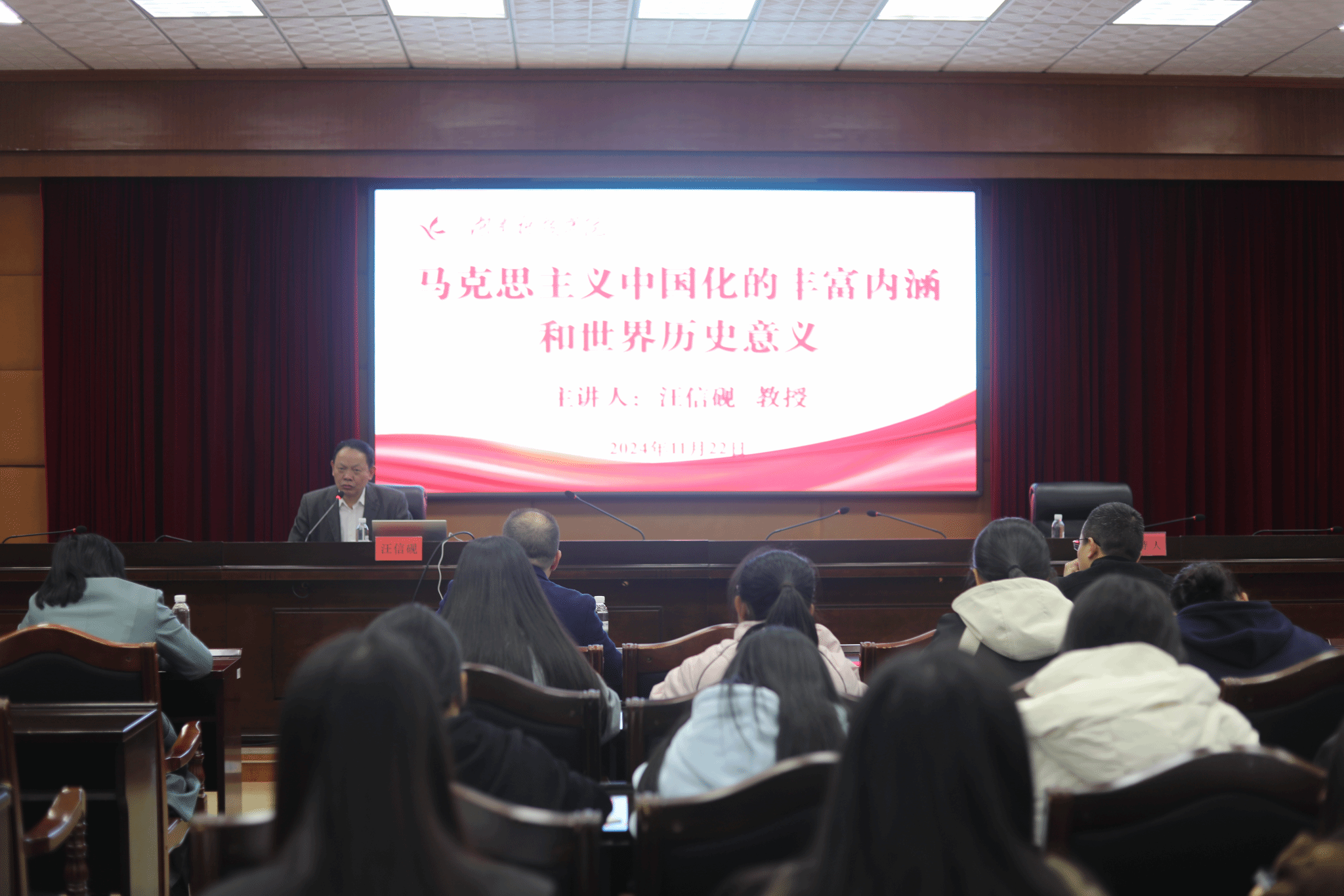 本网讯(通讯员 陈小燕)11月22日,武汉大学人文社会科学资深教授、哲学院教授、博士生导师汪信砚应邀来校,在行政楼801会议室为bat365官网师生作了题为《马克思主义中国化的丰富内涵和世界历史意义》的学术讲座,讲座由党委委员、副校长何海教授主持。