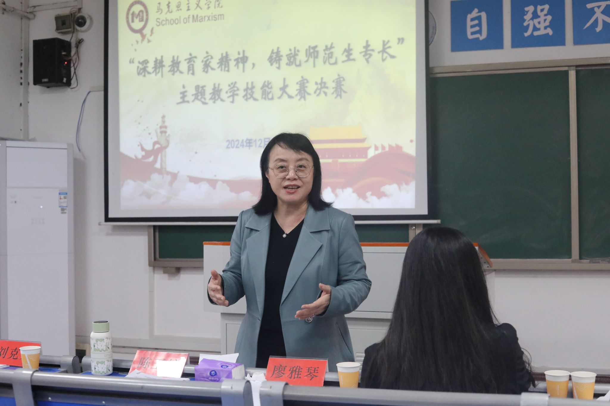 本网讯(通讯员 杨鑫杰 易淑妍)12月3日,马克思主义学院于鹤鸣楼501教室成功举办以“深耕教育家精神,铸就师范生专长”为主题的师范生技能大赛决赛。由马克思主义学院院长廖雅琴、党总支书记陈玉皎以及优秀青年教师陈小燕、刘克方、谢周艳共同担任评委。