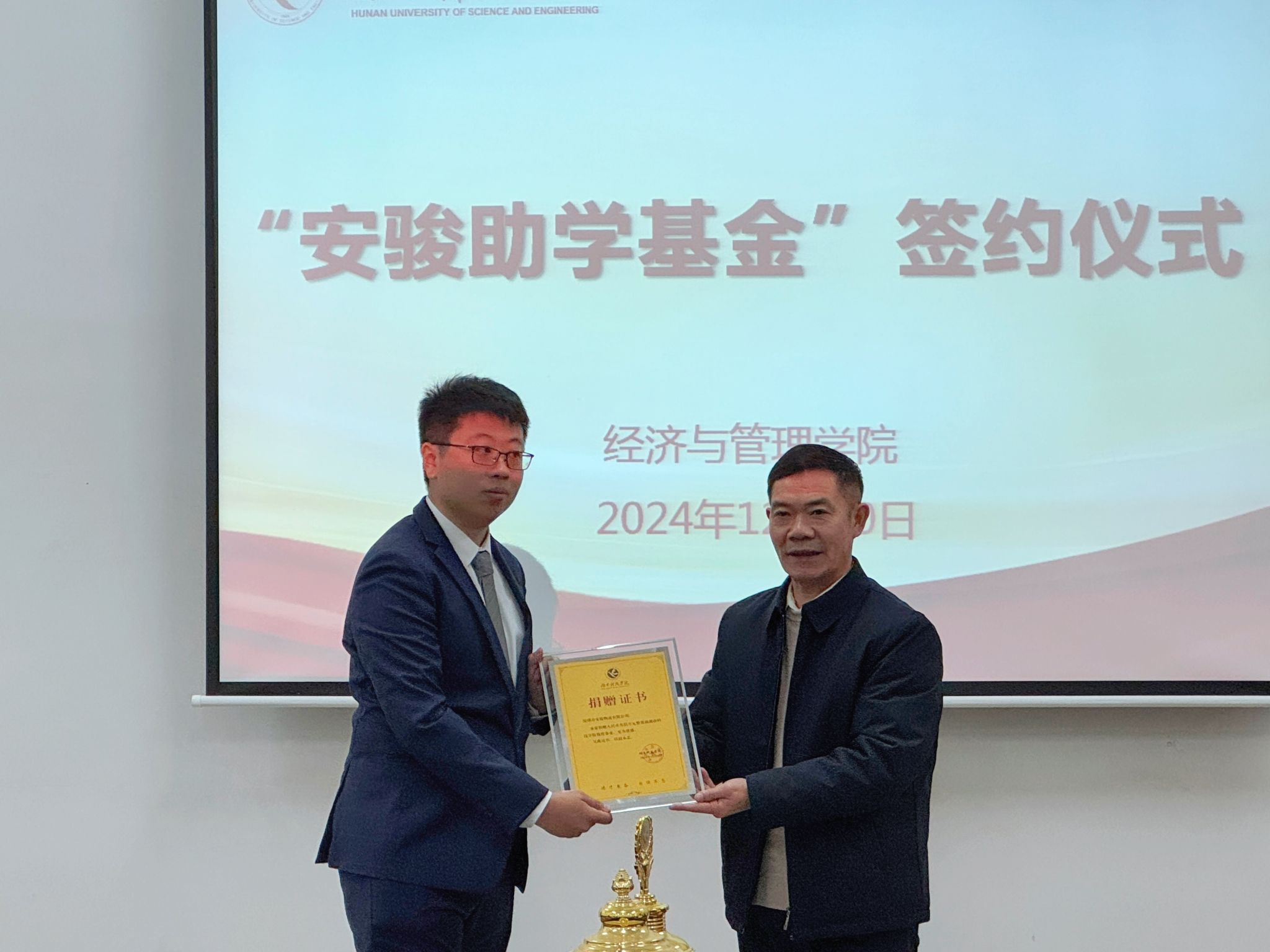 龙诗颐对深圳市安骏物流有限公司资助经济与管理学院贫困学生进行了感谢,陈泽代表经济与管理学院2002届优秀校友、深圳市安骏物流有限公司董事长方轲捐赠300万元设立助学金,陈泽还转达了方轲对母校的感恩之情和助力母校教育事业发展的心愿。