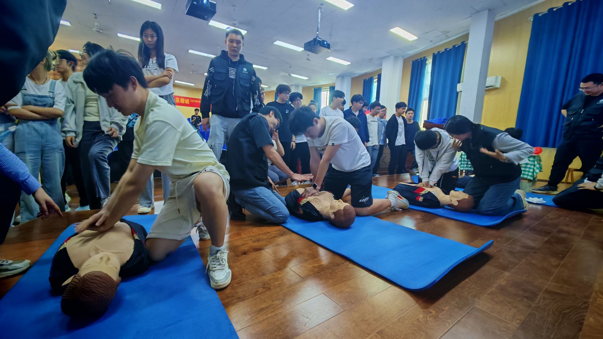 讲座结束后,两名医护专家开展了心肺复苏现场救护技术和电除颤救护技术实操示范,同学们在医护专家的指导下,分批体验现场救护操作,现场学习氛围浓厚。
