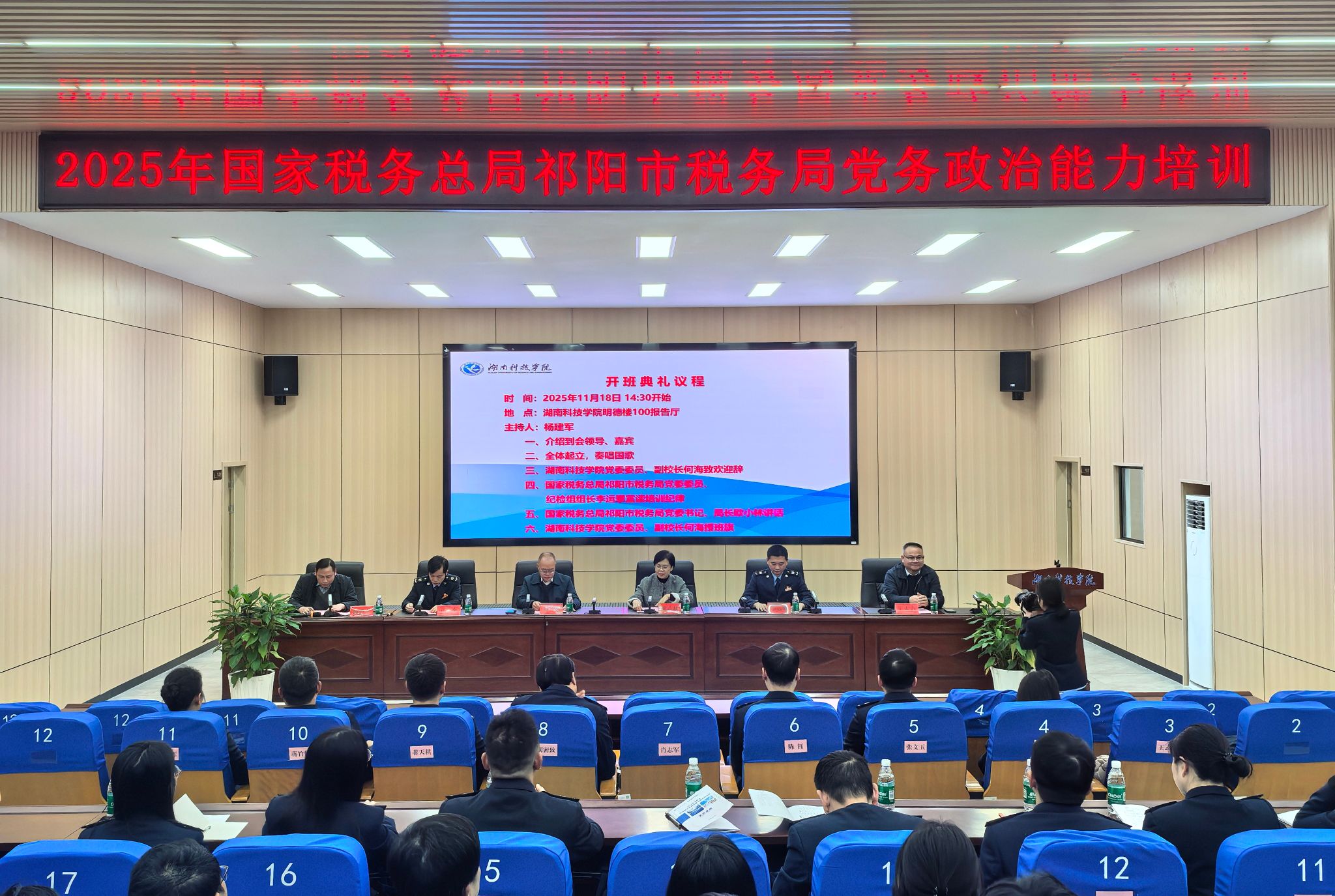 本网讯(通讯员 邹小阳)11月18日,2025年国家税务总局祁阳市税务局党务政治能力培训班在bat365官网开班。校党委委员、副校长何海,祁阳市税务局党委书记、局长欧小林等领导出席开班仪式。来自该市税务系统的52名干部齐聚一堂,开启集中学习之旅。