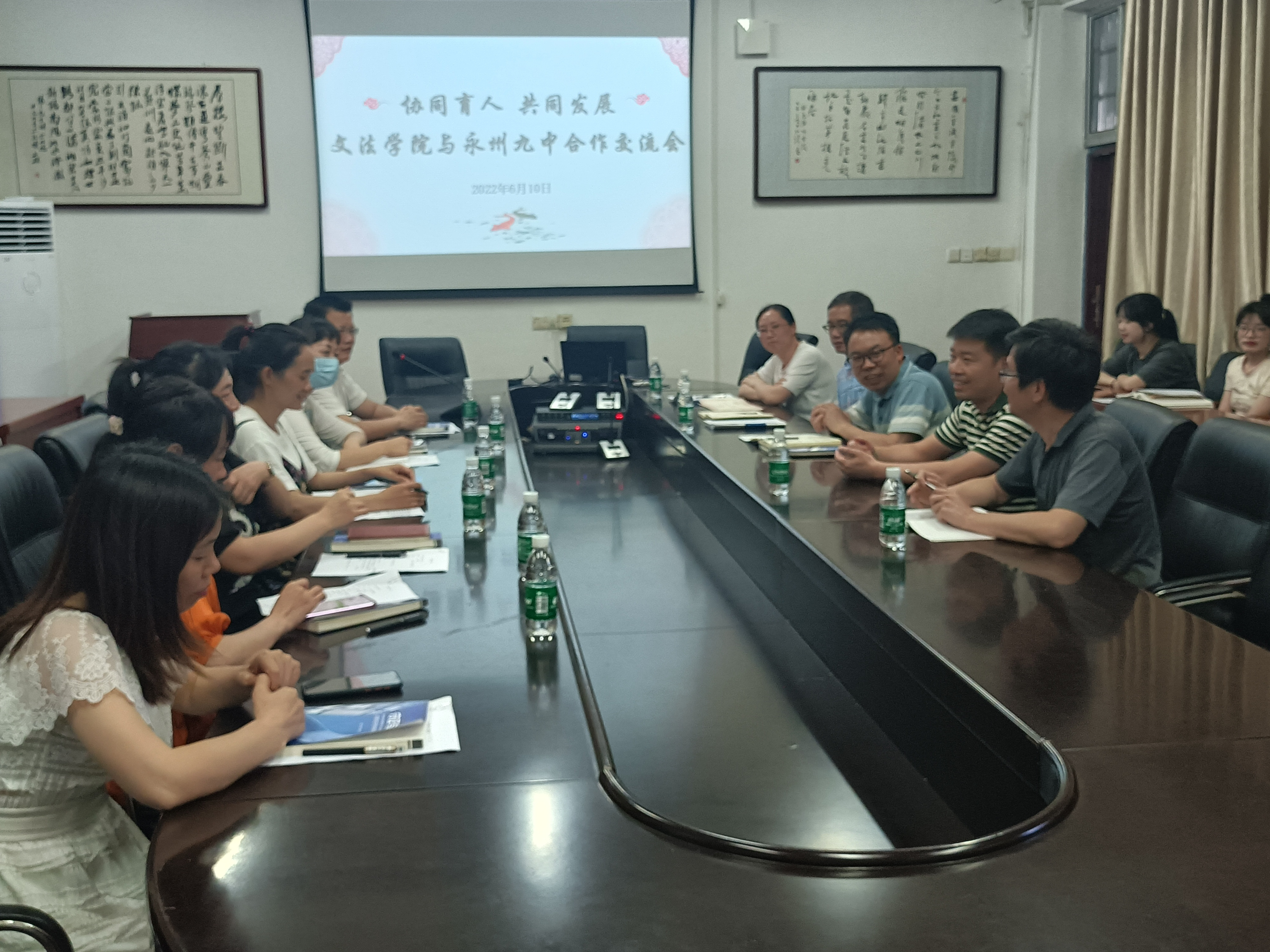 本网讯  6月10日下午,文法学院与永州九中在明德楼举办“协同育人、共同发展”主题合作交流会。教务处副处长张能泉,文法学院院长贡贵训、党总支书记谷显明、副院长肖智成、永州九中教科室主任唐秉中、副主任唐艳红以及2020级卓越教师班全体学员等参加座谈。