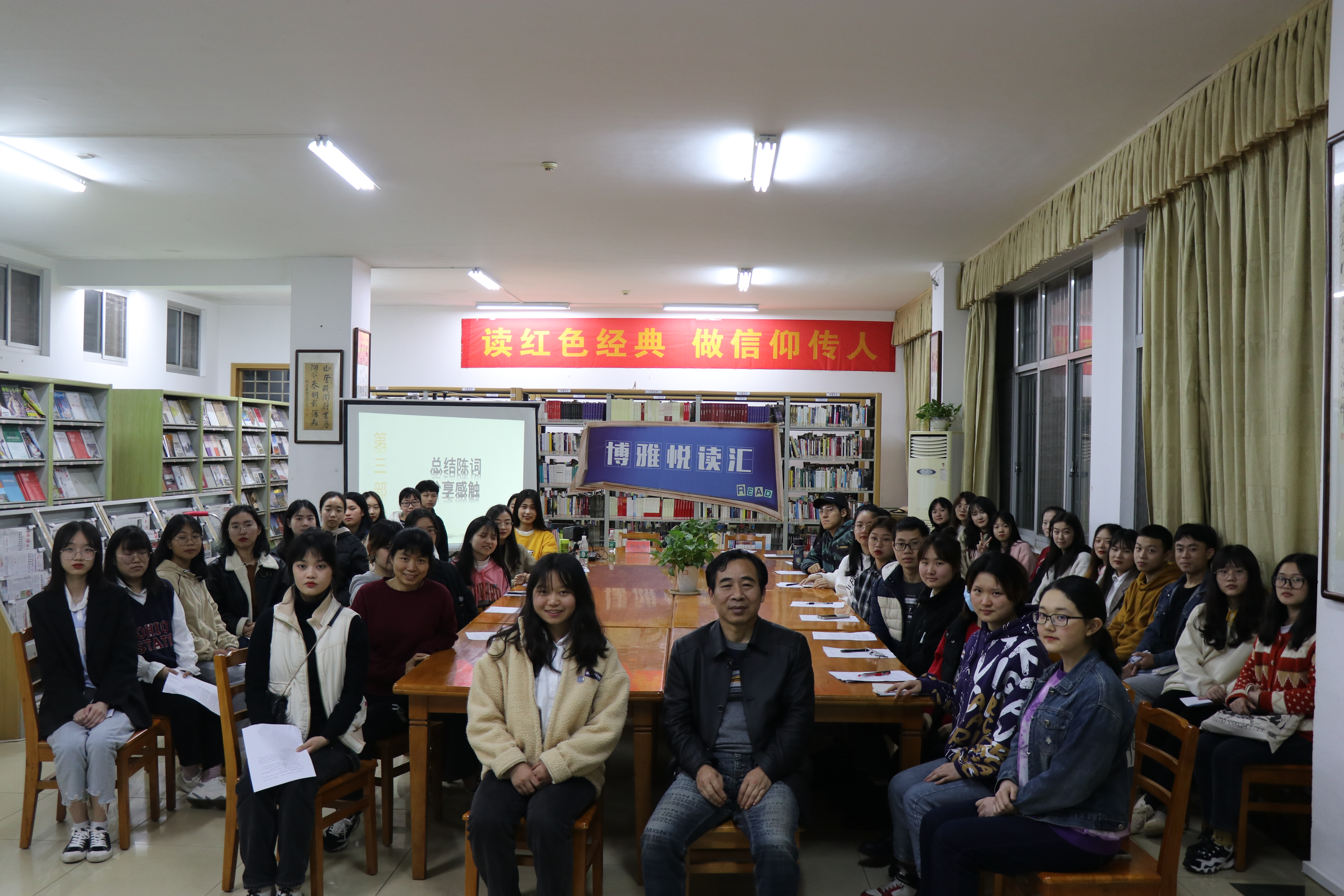 本网讯 4月16日晚,由图书馆与外国语学院共同举办的博雅悦读汇“学四史”专题第二期“学新中国史”读书沙龙在新图书馆举行,活动邀请马克思主义学院柏春林教授为大家分享经典《在庆祝中华人民共和国成立70周年大会上的讲话》,图书馆党员及40名青年学生共同参加此次活动。