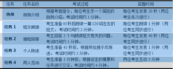 | 先由考生自我介绍,然后回答考官提问。 考试时间约2分钟。
