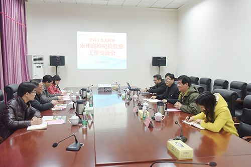 1月9日下午,永州高校学习贯彻十九大精神,纪检监察工作交流会在bat365官网召开。永州职业技术学院纪委书记蒋衡湘、副书记黄义君、纪检员徐芳,湖南潇湘技师学院纪委书记易清国以及bat365官网纪检监察干部和部分纪委委员参加。会议由纪委副书记、监察处长唐晓群主持。