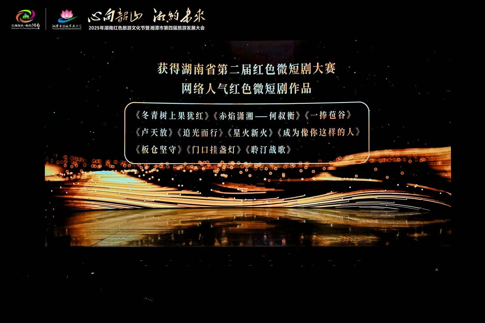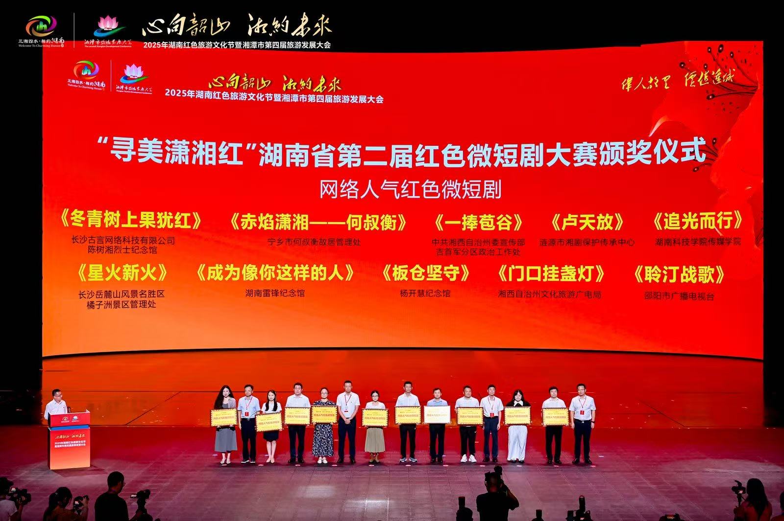本网讯(通讯员 喻烨)7月11日,2025年湖南红色旅游文化节暨湘潭市第四届旅游发展大会在伟人故里韶山盛大开幕。开幕式上,“寻美潇湘红”湖南省第二届红色微短剧大赛颁奖仪式备受瞩目。bat365官网传媒学院2022级学生曹思思、喻烨、何姿英、李曼姝、蒋文芳创作的作品《追光而行》荣获“网络人气红色微短剧”奖,成为全省唯一高校获奖作品。