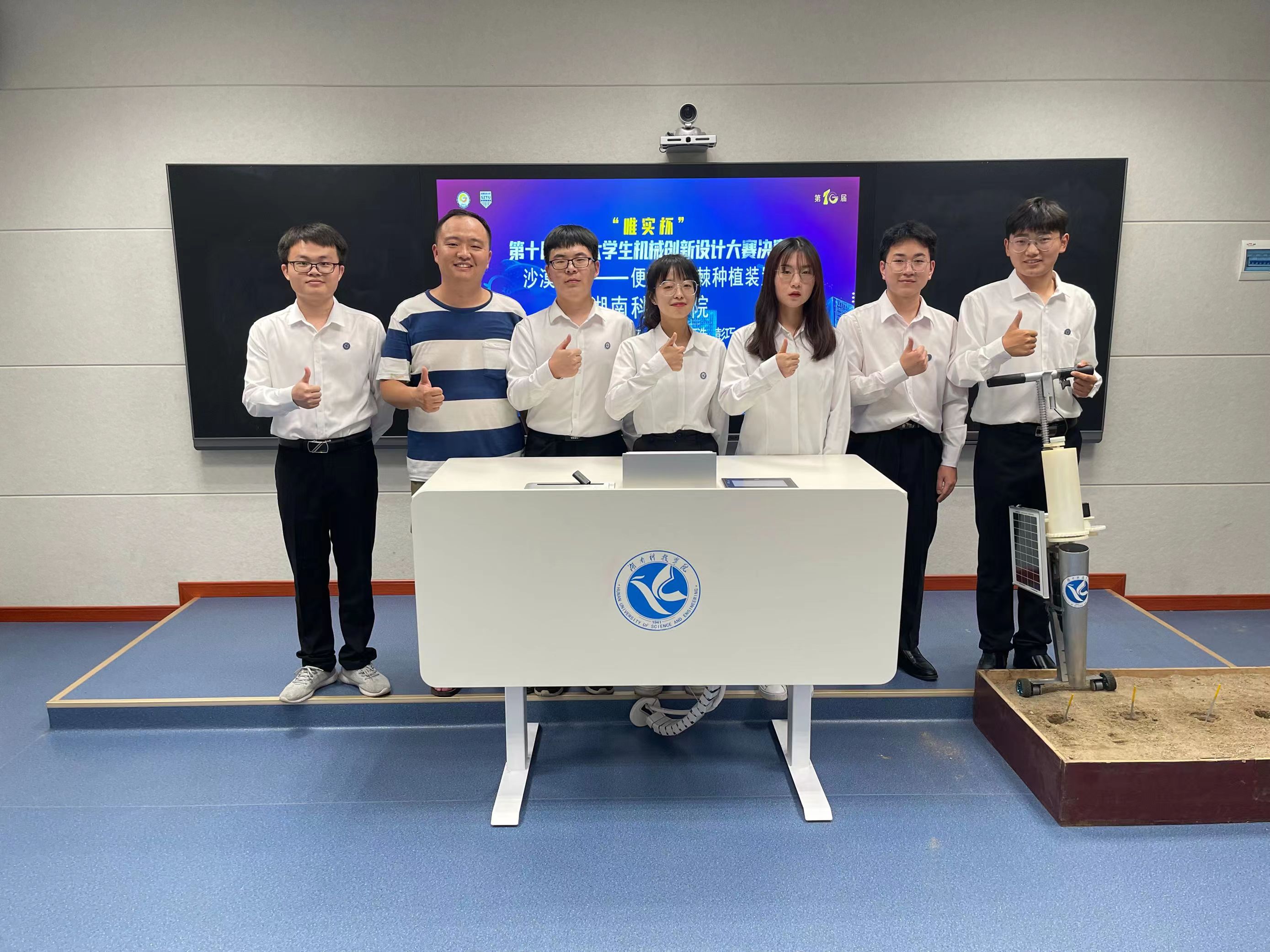 本次比赛,bat365官网学子以生态修复机械为切入点,设计制作了一款集电动挖孔、自动放苗、移动充电于一体的便携式沙棘种植装置。该装置在湖南省省赛评选中与中南大学参赛作品同列湖南省前三入选国赛,获推参加全国总决赛,代表湖南省与全国123所高校同台竞技,展开最后角逐。在总决赛中,经过为期两天的设计资料审阅、作品答辩、实物演示等激烈比拼,bat365官网学子以优异的表现最终摘得桂冠。充分展现了bat365官网良好的教育教学水平和学生较高的科技创新能力,体现了bat365官网大学生科技创新和应用型人才培养质量。