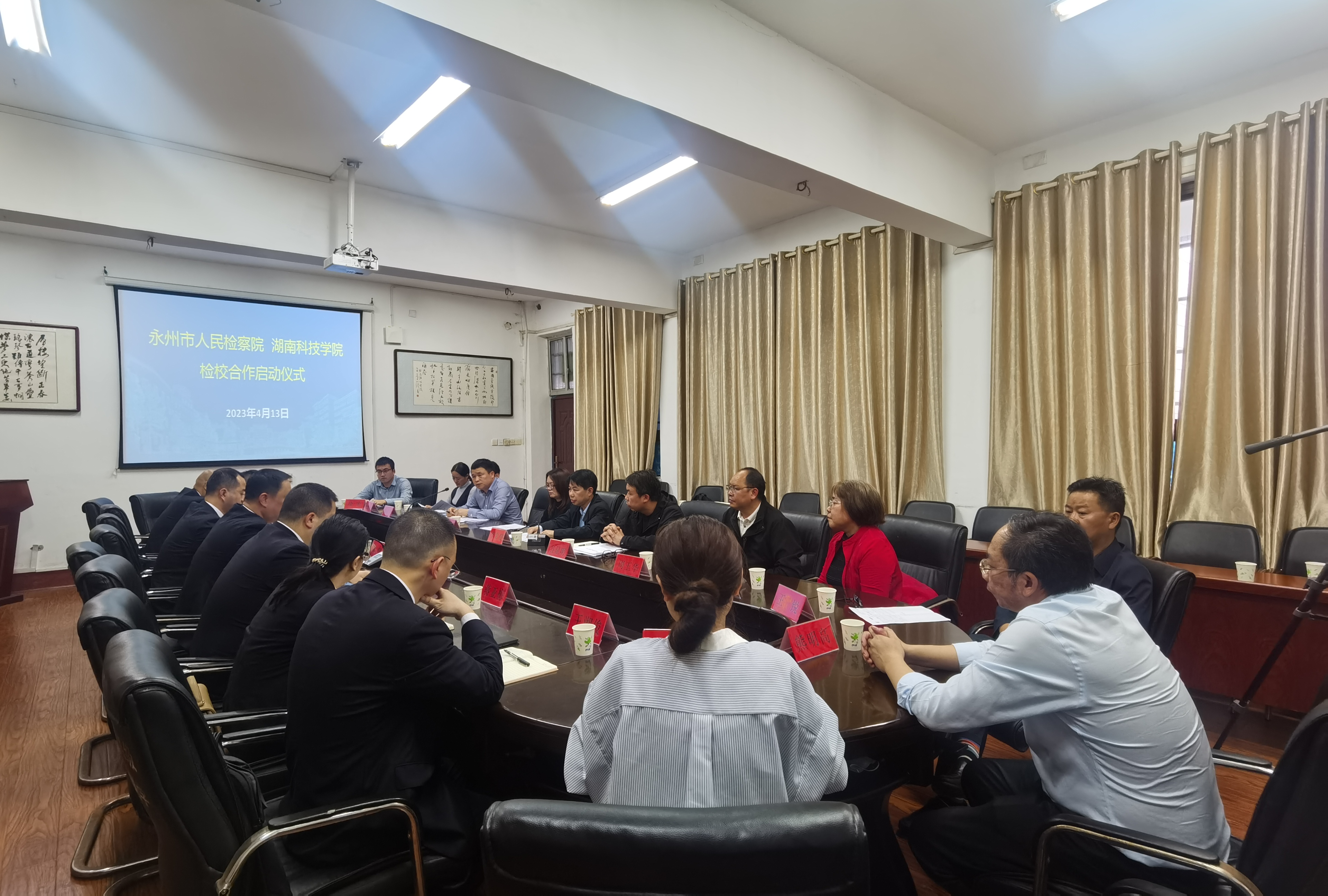 本网讯 4月13日下午,永州市人民检察院与bat365中文官方网站合作启动仪式举行。永州市人民检察院党组成员、副检察长周辉,党委委员、副校长李常健,教务处处长张剑等出席仪式。