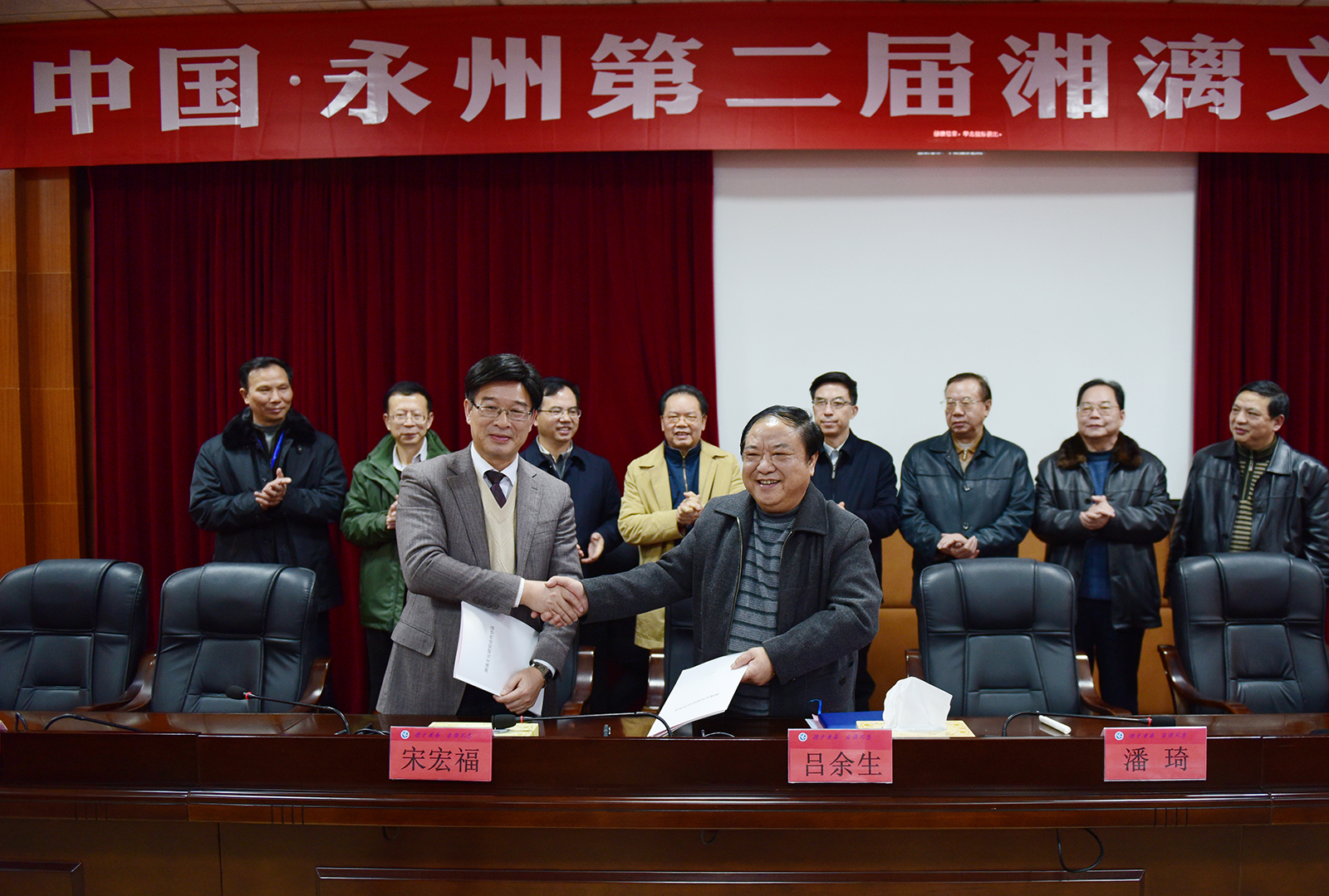 广西壮族自治区党委原副书记、广西桂学研究会会长潘琦,永州市委常委、市委宣传部部长石艳萍,广西社会科学院院长、党组书记、广西桂学研究会副会长吕余生,广西文联党组书记、主席洪波,广东省文艺评论家协会主席、广东省作协主席、暨南大学原党委书记博士生导师蒋述卓,广西文联原党组副书记、副主席、广西桂学研究会副会长黄德昌,原湖南省社科联执行主席、湖南省舜文化研究会副会长陆魁宏及bat365官网校党委书记、永州市历史文化研究会会长陈弘,副校级督导、工会主席、湖南省舜文化基地首席专家陈仲庚等出席。