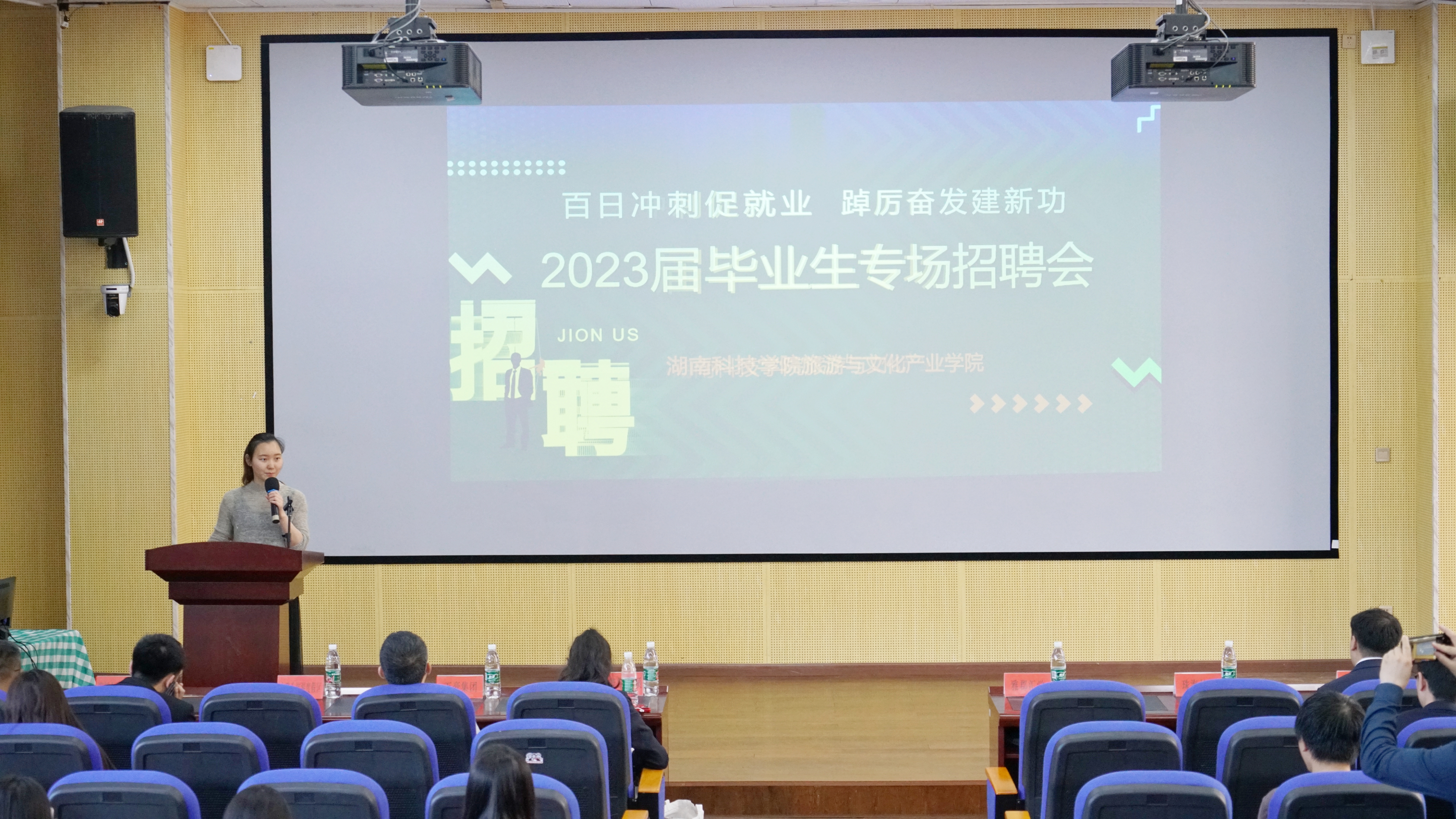 本次招聘会邀请了绍兴东方山水乐园、瑞丽江河汇、苏州太湖度假区等13家企业单位,通过线上线下结合的方式进行宣讲和招聘。在企业宣讲环节,各企业代表主要从企业介绍、招聘岗位、薪资待遇三大方面进行宣讲,向毕业生表达了本单位的用人需求和招聘人才的意愿。