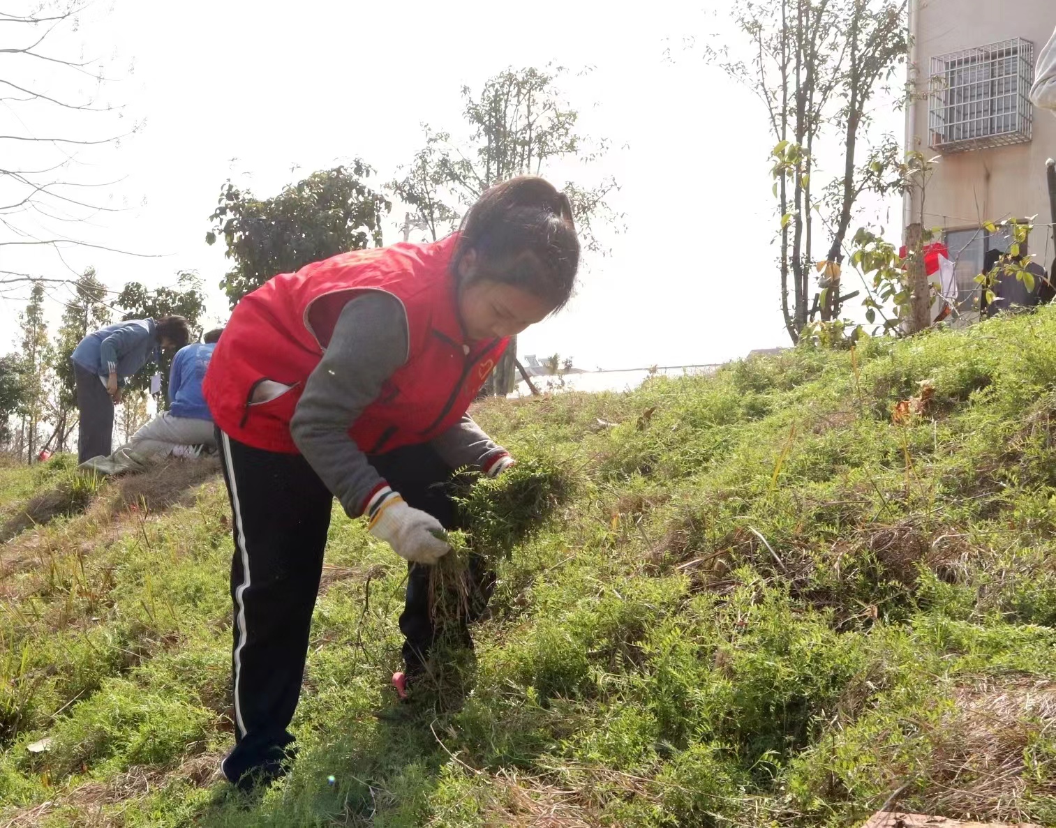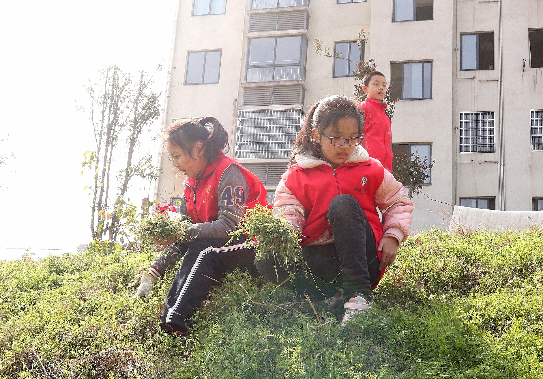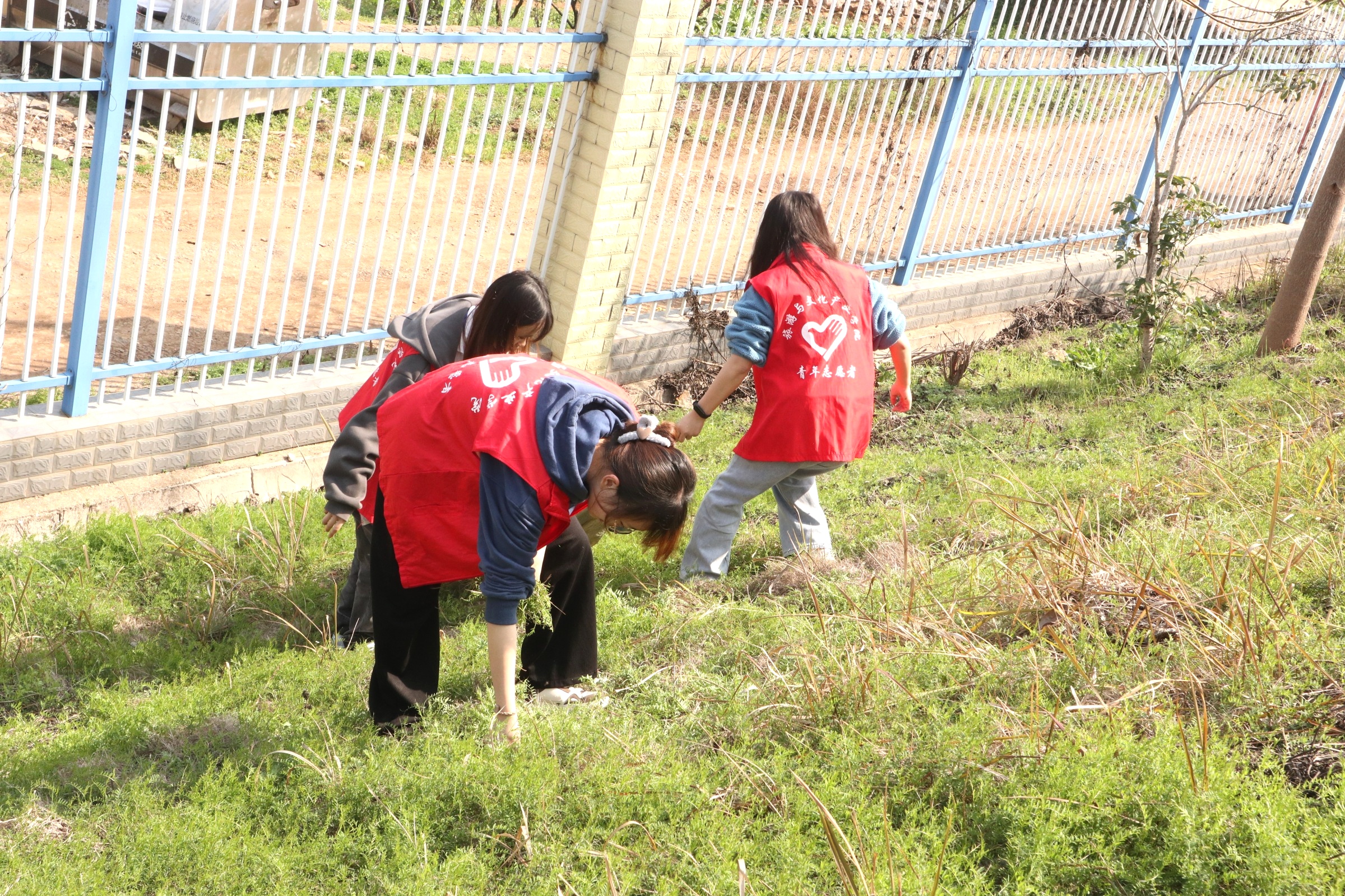 温暖的阳光下,一双双大手,一双双小手,割的割,拔的拔,不一会就采集了几大袋鱼草。开始一些小志愿者们参加劳动还有点扭扭捏捏,但在看到了劳动成果后,欢喜之情溢于言表。最让人期待的时刻莫过于要给鱼儿喂草了,志愿者们顾不了手的酸疼,扛着、提着、抬着“劳动成果”快步走向人工湖,向鱼儿投递鱼草。“你们看!好多鱼过来了!”一些鱼儿看到了美食,纷纷游来,但因为看见岸上阵势太大,又有点不敢靠近。志愿者们心有不甘,于是转移阵地投草,让这群谨慎的鱼安心享用食物。鱼儿看见“大部队”远去后,毫不客气地干起饭来。