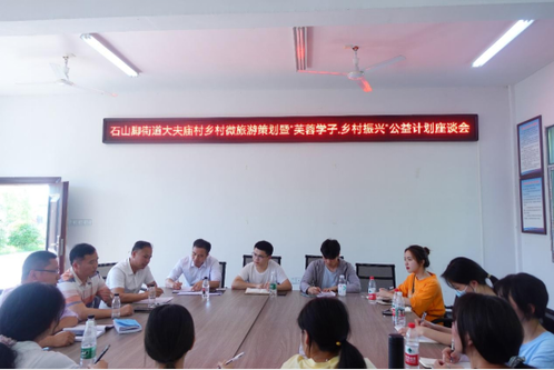 交流会上,沈勇军支书从产业、村情、交通、文化等方面向团队介绍了大夫庙村乡村旅游的发展现状。大夫庙村第一产业以水稻、油茶及果树种植为主,有超千亩的水稻及油茶种植面积,境内旅游资源十分丰富,美丽湘江碧波环荡、沿江风光如诗如画、拙岩碑刻底蕴深厚、百年丹桂金秋飘香,主打的“农村味道”乡村旅游点吸引了众多游客。