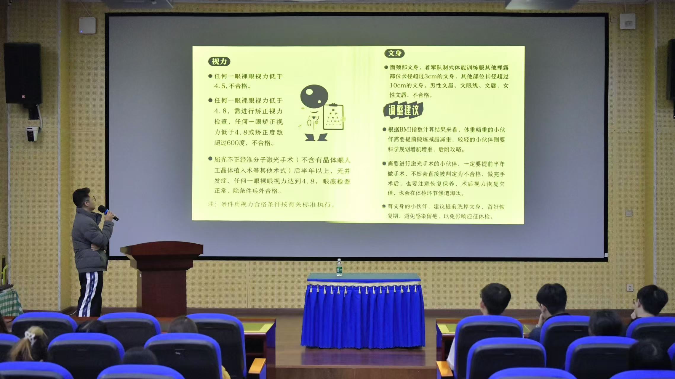 动员大会上,李满辅导员首先强调了征兵入伍报名时间的重要性,希望我院有意向参军学子按时报名早日入伍。随后李满辅导员指出征兵入伍在身高、体重、视力等方面都有严格的规定,为同学们解答了关于身体条件和报名时间方式等方面的问题。在会上,他举出部分退伍大学生在经济补贴、就业安置的优厚待遇以及相关的复学升学优待上的实例,这使学生们意识到国家永远是最坚实的后盾,为学子的参军提供坚实的保障。