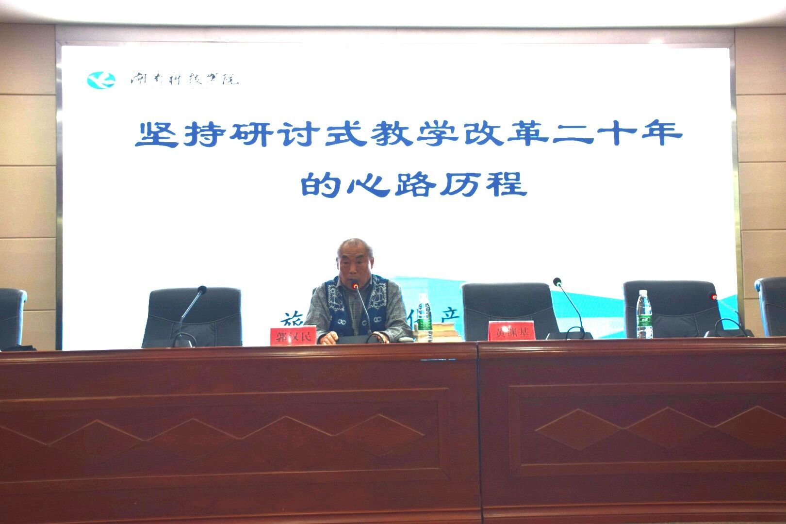 郭汉民向师生们分享了他坚持研讨式教学改革二十年中的所思、所想、所做。他谈到,他90年代起着手研究研讨式教学,想打破填鸭式教学,这种研讨式教学引起了广泛关注,但在当时褒贬不一,学生的认可促使他坚定地进行改革实验。最终,他总结出了“指导选题、独立探索、小组交流、大班讲评、总结提高”的研讨式五步教学法。2015年,已经退休的郭教授重燃热情,将他的《研讨式教学改革文集》通过各种方式送到各大高校图书馆,并在多地开展讲座。他说:“我想把这种新的教学方式宣传到各大高校,让所有大学生都能真正提高能力,学到东西,而不是只会死记硬背。”