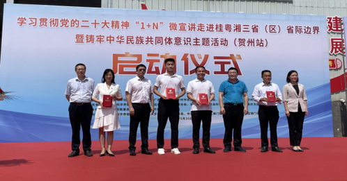 5月30日上午,学习贯彻党的二十大精神“1+N”微宣讲走进省际边界暨铸牢中华民族共同体意识主题活动启动仪式在贺州市八步区铺门镇举行,贺州市社科联主席杨剑华宣布活动启动,贺州市民宗委主任向云宣读桂粤湘三省(区)省际边界铸牢中华民族共同体意识倡议书,八步区委常委、宣传部长覃远军致辞。活动现场,广西贺州、湖南永州、广东清远、肇庆四市宣讲员代表用通俗易懂的语言及身边的事例,深入浅出地向基层群众宣传阐释党的二十大精神。黄渊基院长获发党的二十大精神“1+N”微宣讲桂粤湘三省(区)四市优秀宣讲员荣誉证书,并在烈日下为当地父老乡亲分享了一场生动鲜活的理论微宣讲,用“小切口”讲述民族团结“大道理”,引导各民族同胞进一步铸牢中华民族共同体意识,凝聚广大干部群众干事创业谋发展的强大精神力量,深受广大群众欢迎。