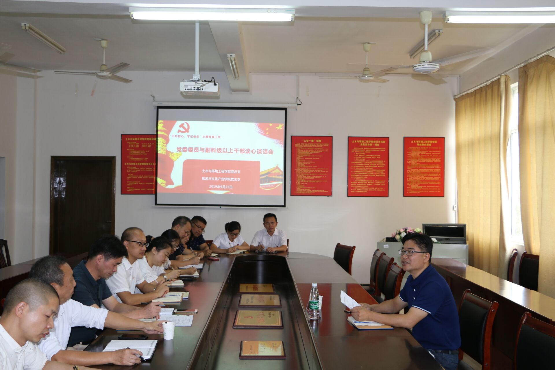 本网讯   9月25日下午,旅游与文化产业学院、土木与环境工程学院“不忘初心、牢记使命”副科级以上干部征求意见座谈会在逸夫楼213会议室召开,校党委委员、纪委书记彭立威参加,纪委监察处处长黄栋陪同。
