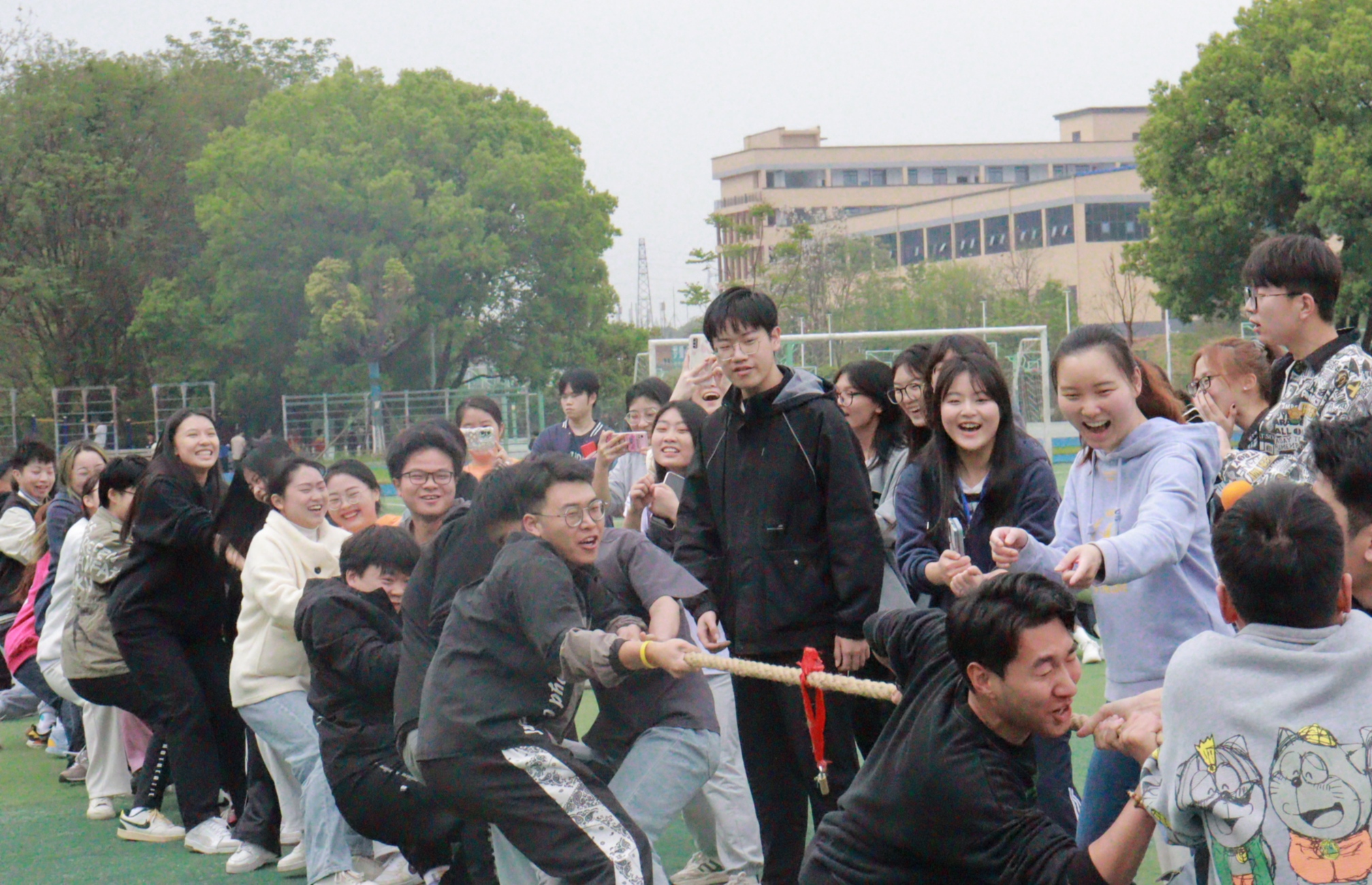 本次素质拓展活动共有“有令必行”、“众志成城”、“齐头并进”、“心有灵犀”、“万众一心”五个项目。“有令必行”率先拉开帷幕,考验着大家的执行力;“心有灵犀”考验了团队之间的默契程度;“众志成城”告诉大家团队胜利才是真正的胜利;“齐头并进”需要参赛者充分沟通才能高效行动;最让人激动的是“万众一心”,双方拔河的同学卯足干劲,旁边喊加油的同学声嘶力竭,将氛围推向了高潮。