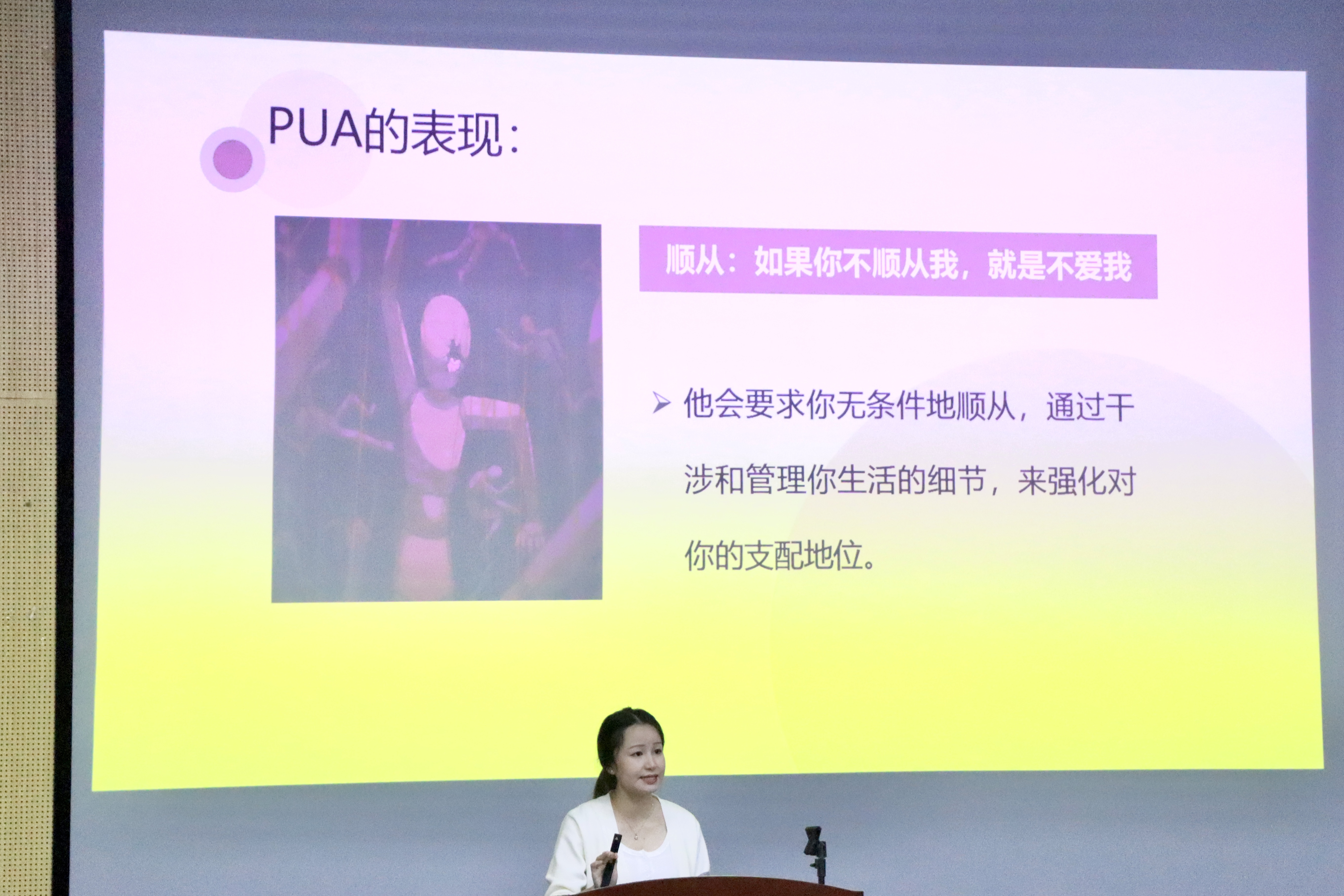 本次讲座从PUA的概念、PUA的表现形式、遭受PUA后的应对措施三个方面展开,有效帮助同学们提高在学习生活和各类亲密关系中识别和应对PUA的能力。首先,主讲人瞿恬湘同学用“如何告知身边的同学你很胖”这一问题引出了对PUA概念的思考,并用职场PUA和校园PUA的典型案例作为互动环节来调查同学们识别PUA的能力,随后在“被要求无条件顺从对方”“被对方切断自己与外界的联系”“被对方贬低,打击自信心”“遭受对方不同程度的暴力与虐待”等四种典型的PUA表现形式进行详细讲解。