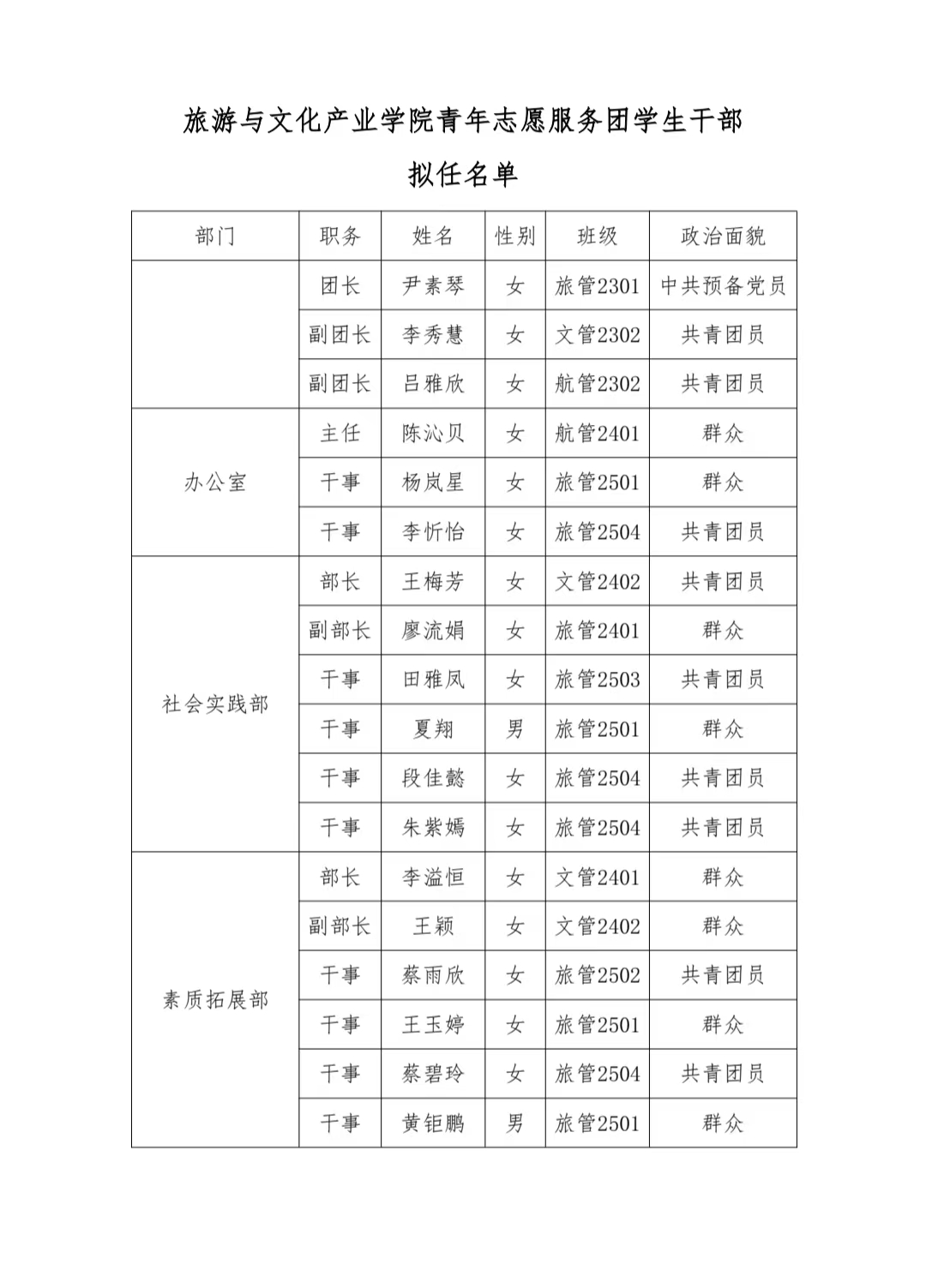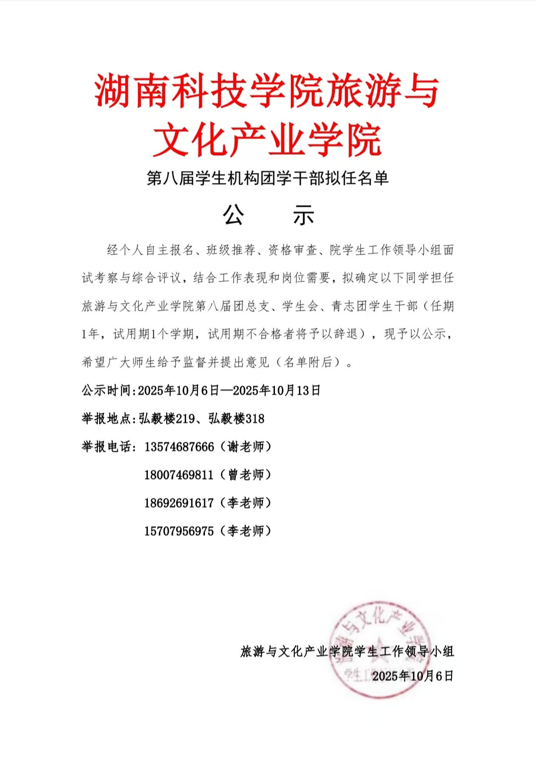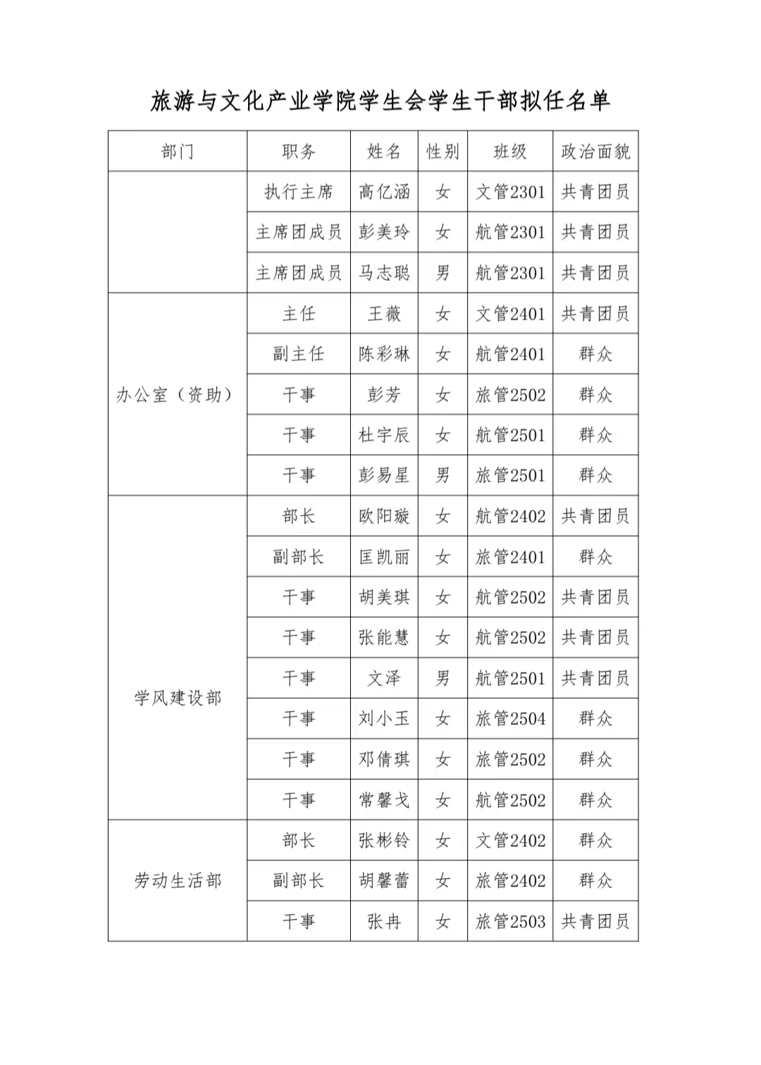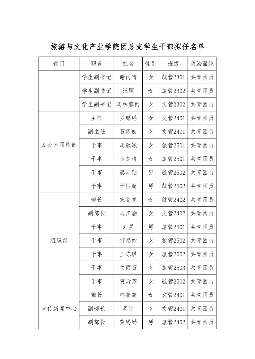 旅游与文化产业学院第八届学生机构团学干部拟任名单公示